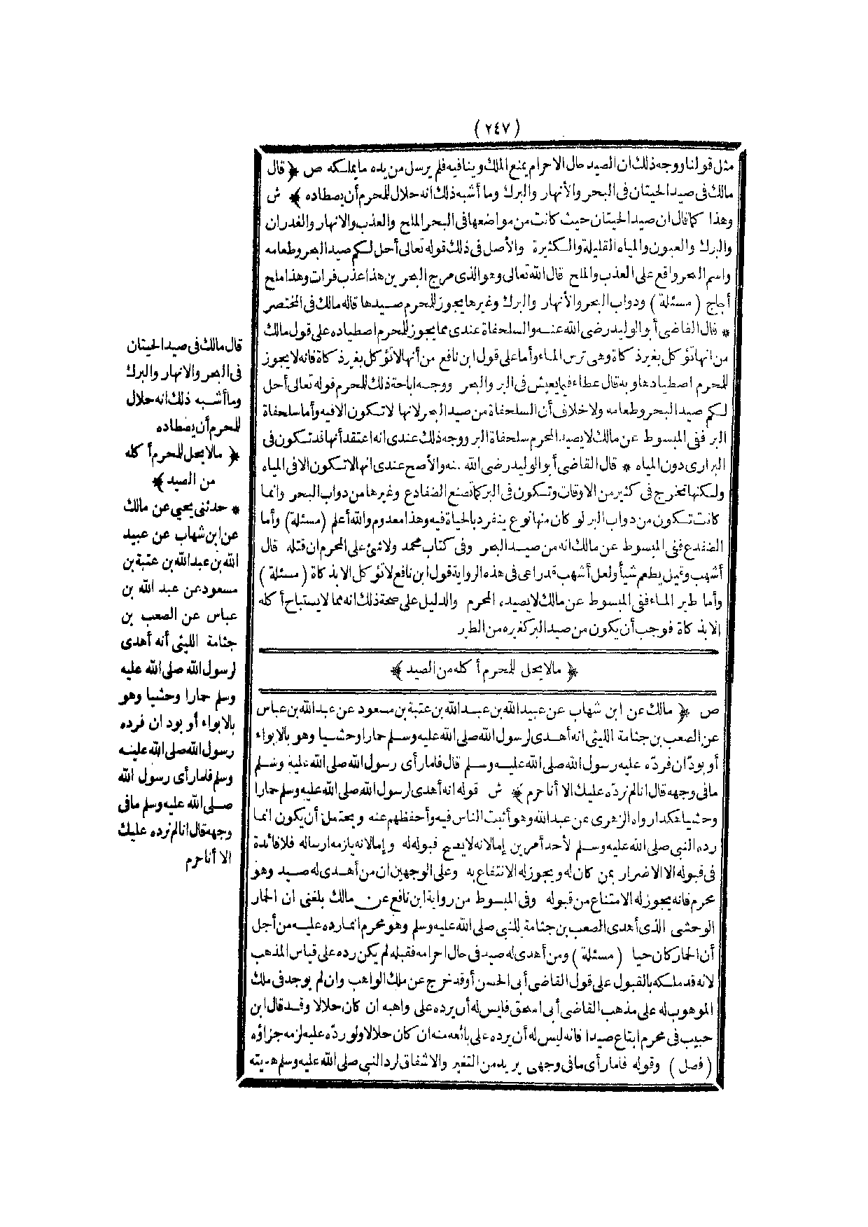 (ص) : (قَالَ مَالِكٌ فِي صَيْدِ الْحِيتَانِ فِي الْبَحْرِ وَالْأَنْهَارِ وَالْبِرَكِ وَمَا أَشْبَهَ ذَلِكَ أَنَّهُ حَلَالٌ لِلْمُحْرِمِ أَنْ يَصْطَادَهُ) .