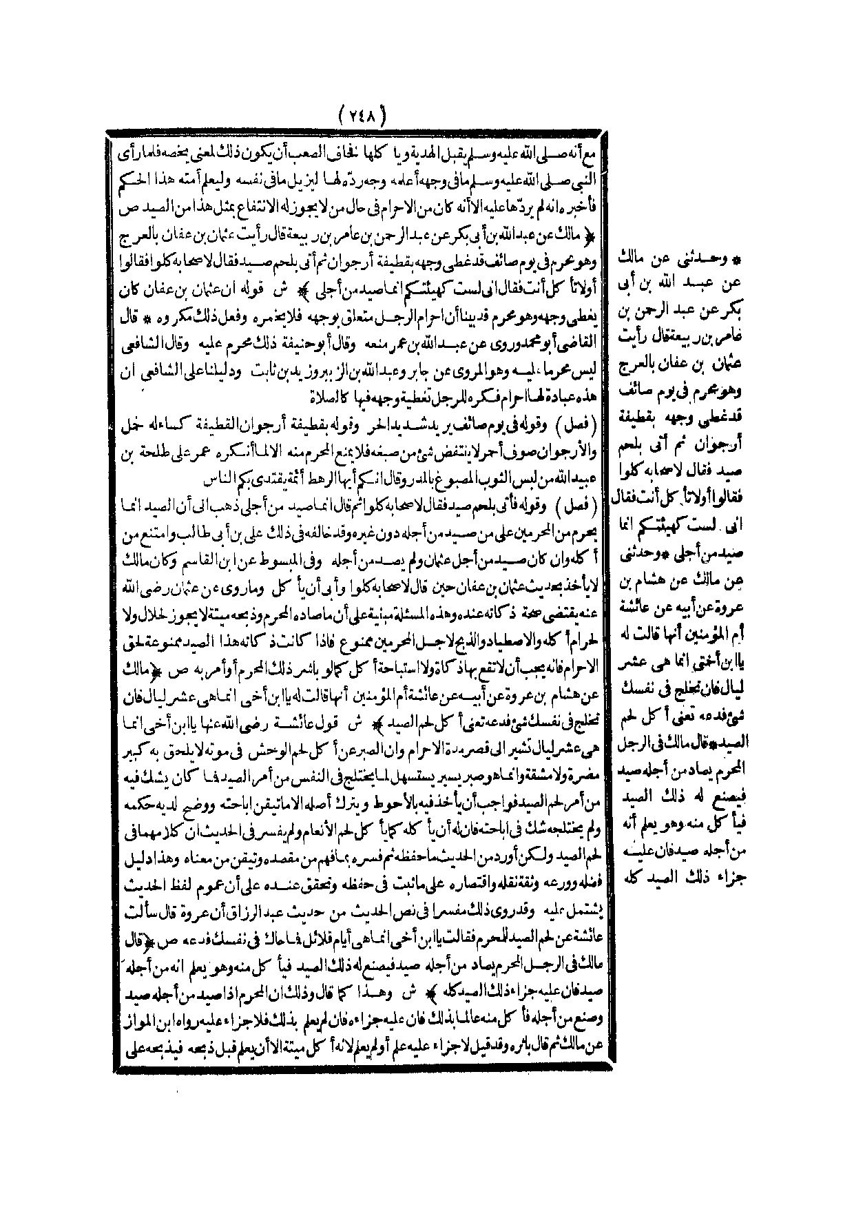 (ص) : (مَالِكٌ عَنْ عَبْدِ اللَّهِ بْنِ أَبِي بَكْرٍ عَنْ عَبْدِ الرَّحْمَنِ بْنِ عَامِرِ بْنِ رَبِيعَةَ قَالَ رَأَيْت عُثْمَانَ بْنَ عَفَّانَ بِالْعَرْجِ وَهُوَ مُحْرِمٌ فِي يَوْمٍ صَائِفٍ قَدْ غَطَّى وَجْهَهُ بِقَطِيفَةِ أُرْجُوَانٍ، ثُمَّ أُتِيَ بِلَحْمِ صَيْدٍ فَقَالَ لِأَصْحَابِهِ كُلُوا فَقَالُوا: أَوَّلًا تَأْكُلُ أَنْتَ فَقَالَ: إنِّي لَسْت كَهَيْئَتِكُمْ إنَّمَا صِيدَ مِنْ أَجْلِي) .