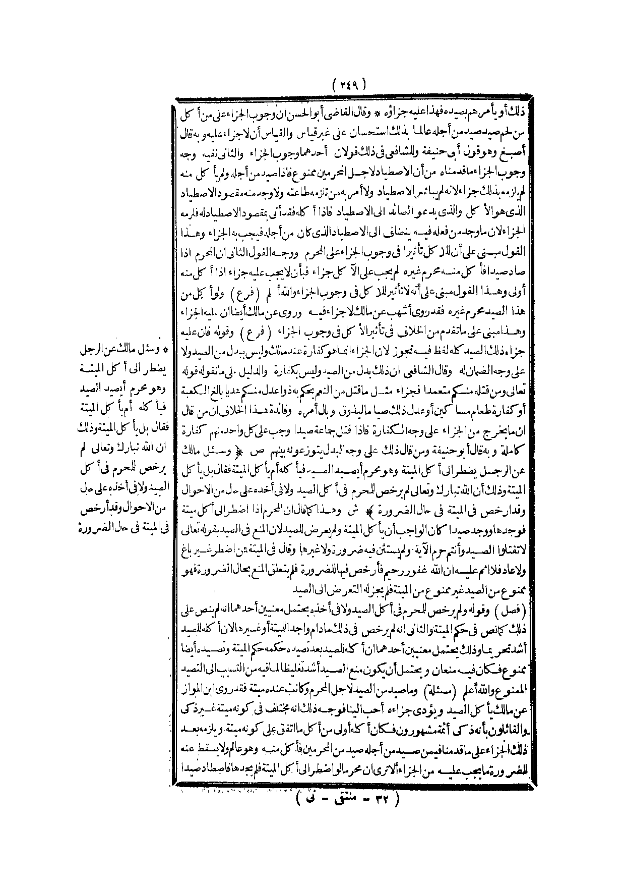 (فَرْعٌ) : وَقَوْلُهُ فَإِنَّ عَلَيْهِ جَزَاءَ ذَلِكَ الصَّيْدِ كُلَّهُ لَفْظٌ فِيهِ تَجَوُّزٌ؛ لِأَنَّ الْجَزَاءَ إنَّمَا هُوَ كَفَّارَةٌ عِنْدَ مَالِكٍ وَلَيْسَ بِبَدَلٍ مِنْ الصَّيْدِ وَلَا عَلَى وَجْهِ الضَّمَانِ لَهُ وَقَالَ الشَّافِعِيُّ أَنَّ ذَلِكَ بَدَلٌ مِنْ الصَّيْدِ وَلَيْسَ بِكَفَّارَةٍ وَالدَّلِيلُ عَلَى مَا نَقُولُهُ قَوْله تَعَالَى {وَمَنْ قَتَلَهُ مِنْكُمْ مُتَعَمِّدًا فَجَزَاءٌ مِثْلُ مَا قَتَلَ مِنَ النَّعَمِ يَحْكُمُ بِهِ ذَوَا عَدْلٍ مِنْكُمْ هَدْيًا بَالِغَ الْكَعْبَةِ أَوْ كَفَّارَةٌ طَعَامُ مَسَاكِينَ أَوْ عَدْلُ ذَلِكَ صِيَامًا لِيَذُوقَ وَبَالَ أَمْرِهِ} [المائدة: 95] وَفَائِدَةُ هَذَا الْخِلَافِ أَنَّ مَنْ قَالَ: إنَّ مَا يَخْرُجُ مِنْ الْجَزَاءِ عَلَى وَجْهِ الْكَفَّارَةِ فَإِذَا قَتَلَ جَمَاعَةٌ صَيْدًا وَجَبَ عَلَى كُلِّ وَاحِدٍ مِنْهُمْ كَفَّارَةٌ كَامِلَةٌ وَبِهِ قَالَ أَبُو حَنِيفَةَ وَمَنْ قَالَ ذَلِكَ عَلَى وَجْهِ الْبَدَلِ يَتَوَزَّعُونَهُ بَيْنَهُمْ.