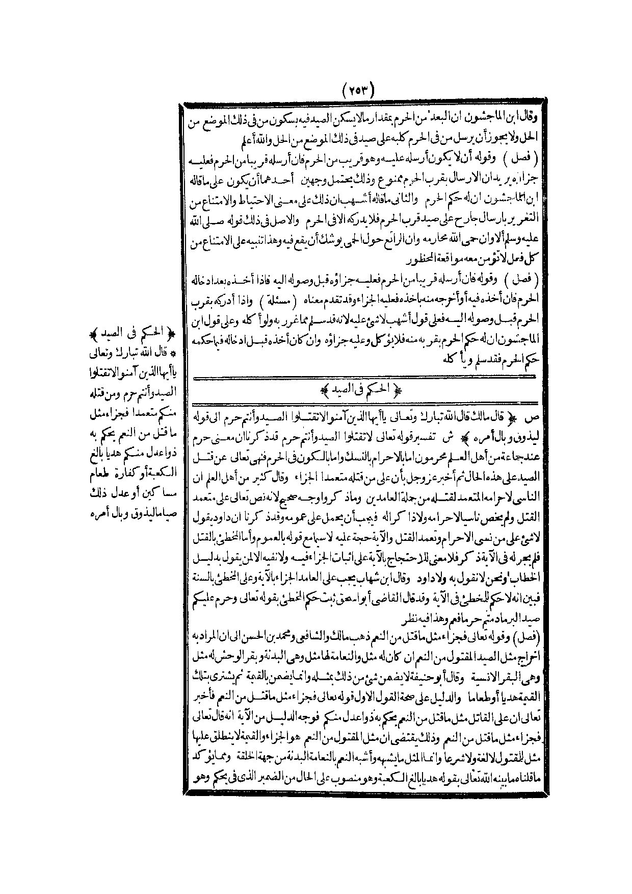 (ش) : تَفْسِيرُ قَوْله تَعَالَى {لا تَقْتُلُوا الصَّيْدَ وَأَنْتُمْ حُرُمٌ} [المائدة: 95] قَدْ ذَكَرْنَا أَنَّ مَعْنَى حُرُمٍ عِنْدَ جَمَاعَةٍ مِنْ أَهْلِ الْعِلْمِ مُحْرِمُونَ إمَّا بِالْإِحْرَامِ بِالنُّسُكِ وَإِمَّا بِالْكَوْنِ فِي الْحَرَمِ فَنَهَى تَعَالَى عَنْ قَتْلِ الصَّيْدِ عَلَى هَذِهِ الْحَالِ، ثُمَّ أَخْبَرَ عَزَّ وَجَلَّ بِأَنَّ عَلَى مَنْ قَتَلَهُ مُتَعَمِّدًا الْجَزَاءَ وَقَالَ كَثِيرٌ مِنْ أَهْلِ الْعِلْمِ: إنَّ النَّاسِيَ لِإِحْرَامِهِ الْمُتَعَمِّدَ لِقَتْلِهِ مِنْ جُمْلَةِ الْعَامِدِينَ وَمَا ذَكَرُوا وَجْهٌ صَحِيحٌ؛ لِأَنَّهُ نَصَّ تَعَالَى مُتَعَمِّدَ الْقَتْلِ وَلَمْ يَخُصَّ نَاسِيًا لِإِحْرَامِهِ وَلَا ذَاكِرًا لَهُ فَيَجِبُ أَنْ يُحْمَلَ عَلَى عُمُومِهِ.