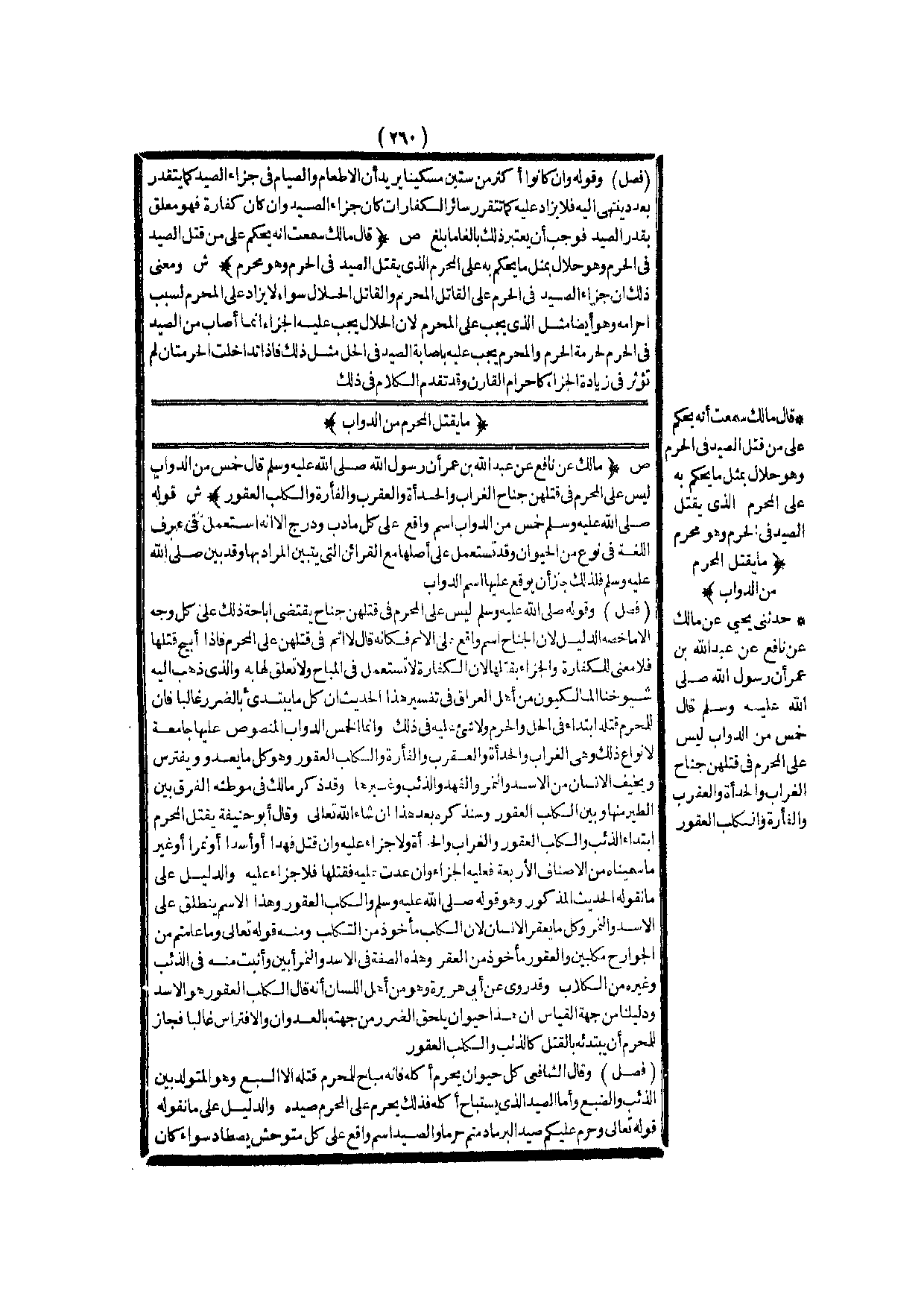 مَا يَقْتُلُ الْمُحْرِمُ مِنْ الدَّوَابِّ (ص) : (مَالِكٌ عَنْ نَافِعٍ عَنْ عَبْدِ اللَّهِ بْنِ عُمَرَ أَنَّ رَسُولَ اللَّهِ - صَلَّى اللَّهُ عَلَيْهِ وَسَلَّمَ - قَالَ «خَمْسٌ مِنْ الدَّوَابِّ لَيْسَ عَلَى الْمُحْرِمِ فِي قَتْلِهِنَّ جُنَاحٌ: الْغُرَابُ وَالْحِدَأَةُ وَالْعَقْرَبُ وَالْفَأْرَةُ وَالْكَلْبُ الْعَقُورُ» )
