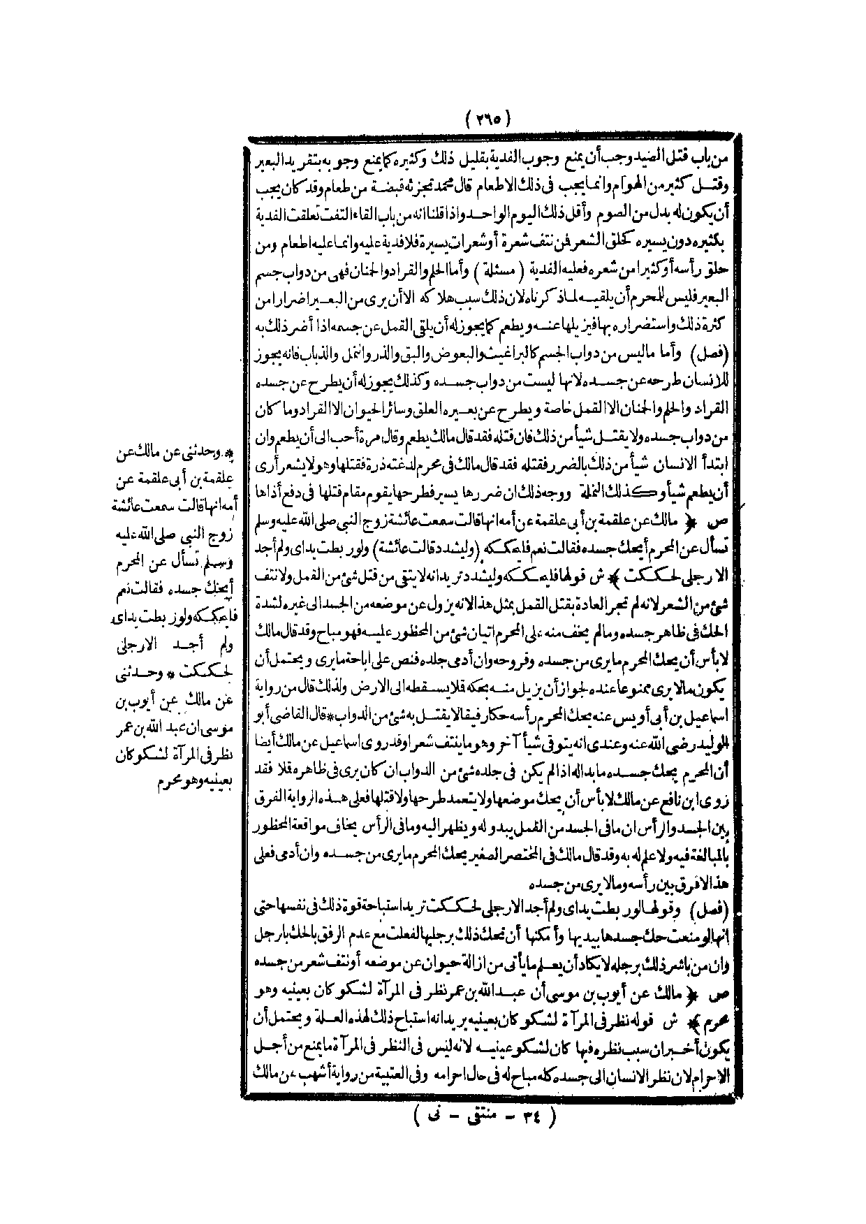 (ص) : (مَالِكٌ عَنْ عَلْقَمَةَ بْنِ أَبِي عَلْقَمَةَ عَنْ أُمِّهِ أَنَّهَا قَالَتْ سَمِعْت عَائِشَةَ زَوْجَ النَّبِيِّ - صَلَّى اللَّهُ عَلَيْهِ وَسَلَّمَ - تَسْأَلُ عَنْ الْمُحْرِمِ أَيَحُكُّ جَسَدَهُ فَقَالَتْ: نَعَمْ فَلْيَحْكُكْهُ (وَلْيَشْدُدْ قَالَتْ عَائِشَةُ) وَلَوْ رُبِطَتْ يَدَايَ وَلَمْ أَجِدْ إلَّا رِجْلِي لَحَكَكْت) .