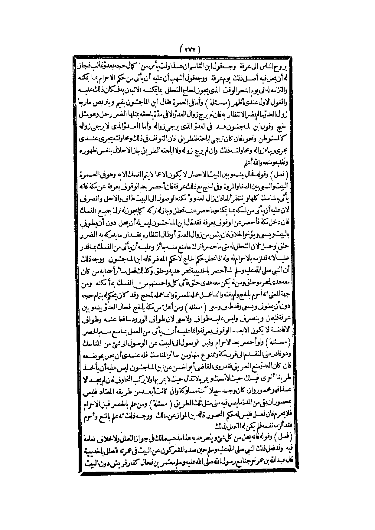 وَقَوْلُهُ فَحَالَ بَيْنَهُ وَبَيْنَ الْبَيْتِ الْإِحْصَارُ لَا يَكُونُ إلَّا عَمَّا لَا يَتِمُّ النُّسُكُ إلَّا بِهِ وَهُوَ فِي الْعُمْرَةِ الْبَيْتُ وَالسَّعْيُ بَيْنَ الصَّفَا وَالْمَرْوَةِ وَفِي الْحَجِّ مَعَ ذَلِكَ عَرَفَةُ فَإِنْ أُحْصِرَ بَعْدَ الْوُقُوفِ بِعَرَفَةَ عَنْ مَكَّةَ فَإِنَّهُ يَأْتِي بِالْمَنَاسِكِ كُلِّهَا وَيَنْتَظِرُ أَيَّامًا فَإِنْ زَالَ الْعَدُوُّ وَأَمْكَنَهُ الْوُصُولُ إلَى الْبَيْتِ طَافَ وَإِلَّا حَلَّ وَانْصَرَفَ؛ لِأَنَّ عَلَيْهِ أَنْ يَأْتِيَ مِنْ نُسُكِهِ بِمَا يُمْكِنُهُ وَمَا حُصِرَ عَنْهُ تَحَلَّلَ وَجَازَ لَهُ تَرْكُهُ كَمَا يَجُوزُ لَهُ تَرْكُ جَمِيعِ النُّسُكِ فَإِنْ دَخَلَ مَكَّةَ فَأُحْصِرَ عَنْ الْوُقُوفِ بِعَرَفَةَ فَقَدْ قَالَ ابْنُ الْمَاجِشُونِ لَيْسَ لَهُ أَنْ يُحِلَّ دُونَ أَنْ يَطُوفَ بِالْبَيْتِ وَيَسْعَى وَيُؤَخِّرَ الْحِلَاقَ فَإِنْ يَئِسَ مِنْ زَوَالِ الْعَدُوِّ أَوْ طَالَ انْتِظَارُهُ بِمِقْدَارِ مَا يُدْرِكُهُ بِهِ الضَّرَرُ حَلَقَ وَحَلَّ؛ لِأَنَّ التَّحَلُّلَ لَهُ مَتَى مَا حُصِرَ فَتَرْكُ مَا مُنِعَ مِنْهُ جَائِزٌ، وَعَلَيْهِ أَنْ يَأْتِيَ مِنْ النُّسُكِ بِمَا قَدَرَ عَلَيْهِ؛ لِأَنَّهُ قَدْ لَزِمَهُ بِالْإِحْرَامِ لَهُ وَلَهُ إذَا تَحَلَّلَ حُكْمُ الْحَاجِّ لَا حُكْمُ الْمُعْتَمِرِ قَالَهُ ابْنُ الْمَاجِشُونِ.
