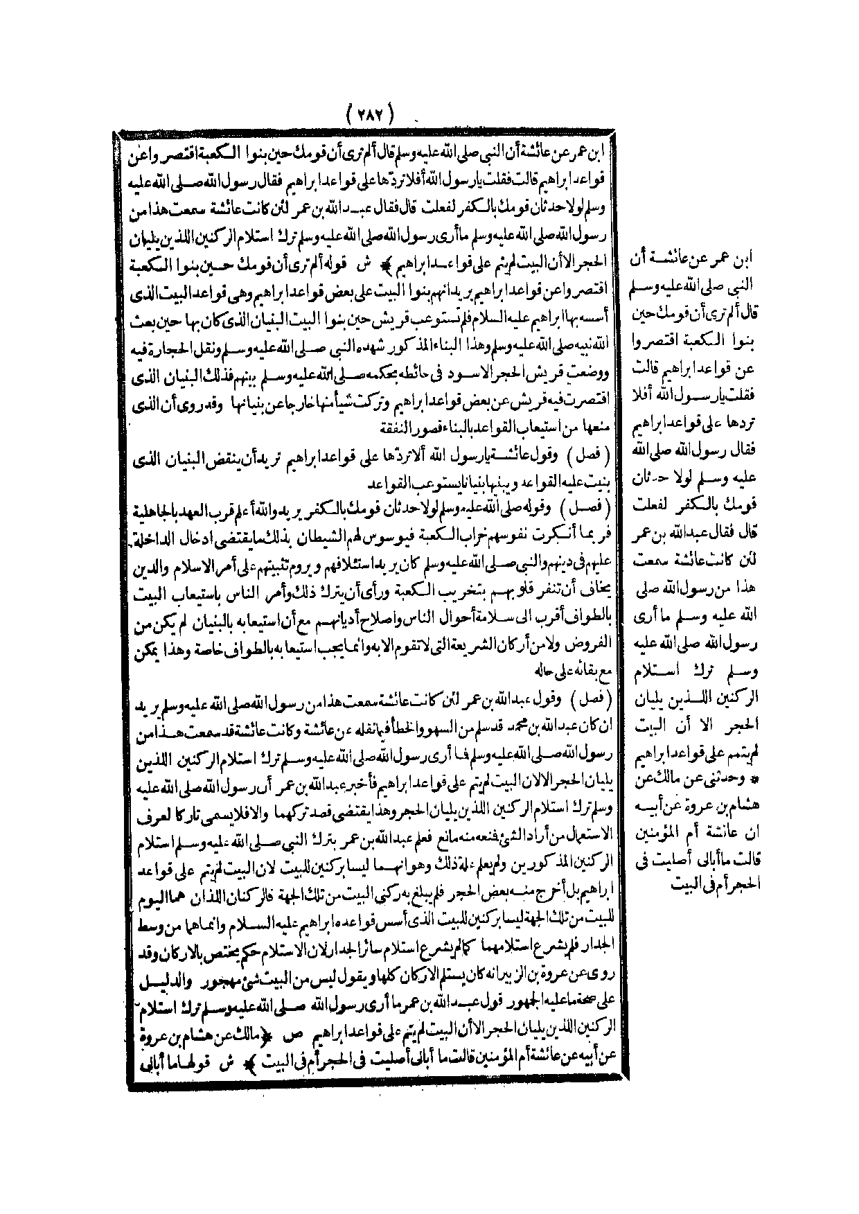 عَبْدَ اللَّهِ بْنَ عُمَرَ عَنْ عَائِشَةَ «أَنَّ النَّبِيَّ - صَلَّى اللَّهُ عَلَيْهِ وَسَلَّمَ - قَالَ أَلَمْ تَرَيْ أَنَّ قَوْمَكِ حِينَ بَنَوْا الْكَعْبَةَ اقْتَصَرُوا عَنْ قَوَاعِدِ إبْرَاهِيمَ قَالَتْ: فَقُلْت: يَا رَسُولَ اللَّهِ أَفَلَا تَرُدُّهَا عَلَى قَوَاعِدِ إبْرَاهِيمَ فَقَالَ رَسُولُ اللَّهِ - صَلَّى اللَّهُ عَلَيْهِ وَسَلَّمَ - لَوْلَا حِدْثَانُ قَوْمِكِ بِالْكُفْرِ لَفَعَلْت» قَالَ فَقَالَ عَبْدُ اللَّهِ بْنُ عُمَرَ لَئِنْ كَانَتْ عَائِشَةُ سَمِعَتْ هَذَا مِنْ رَسُولِ اللَّهِ - صَلَّى اللَّهُ عَلَيْهِ وَسَلَّمَ - مَا أُرَى رَسُولُ اللَّهِ - صَلَّى اللَّهُ عَلَيْهِ وَسَلَّمَ - تَرَكَ اسْتِلَامَ الرُّكْنَيْنِ اللَّذَيْنِ يَلِيَانِ الْحِجْرَ إلَّا أَنَّ الْبَيْتَ لَمْ يَتِمَّ عَلَى قَوَاعِدِ إبْرَاهِيمَ) .