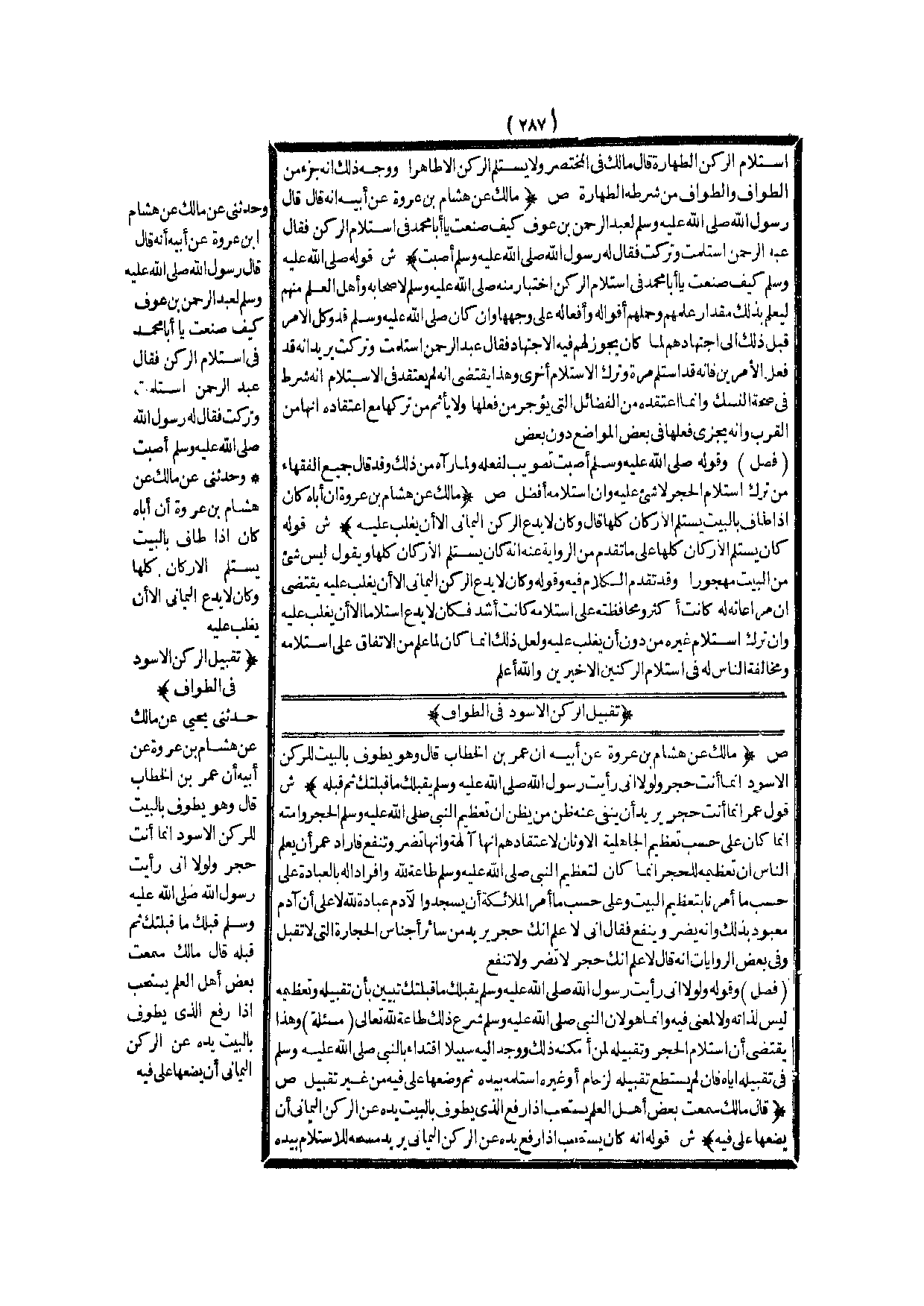 (ص) : (مَالِكٌ عَنْ هِشَامِ بْنِ عُرْوَةَ عَنْ أَبِيهِ أَنَّهُ قَالَ «قَالَ رَسُولُ اللَّهِ - صَلَّى اللَّهُ عَلَيْهِ وَسَلَّمَ - لِعَبْدِ الرَّحْمَنِ بْنِ عَوْفٍ كَيْفَ صَنَعْت يَا أَبَا مُحَمَّدٍ فِي اسْتِلَامِ الرُّكْنِ؟ فَقَالَ عَبْدُ الرَّحْمَنِ اسْتَلَمْت وَتَرَكْت فَقَالَ لَهُ رَسُولُ اللَّهِ - صَلَّى اللَّهُ عَلَيْهِ وَسَلَّمَ - أَصَبْت» ) .