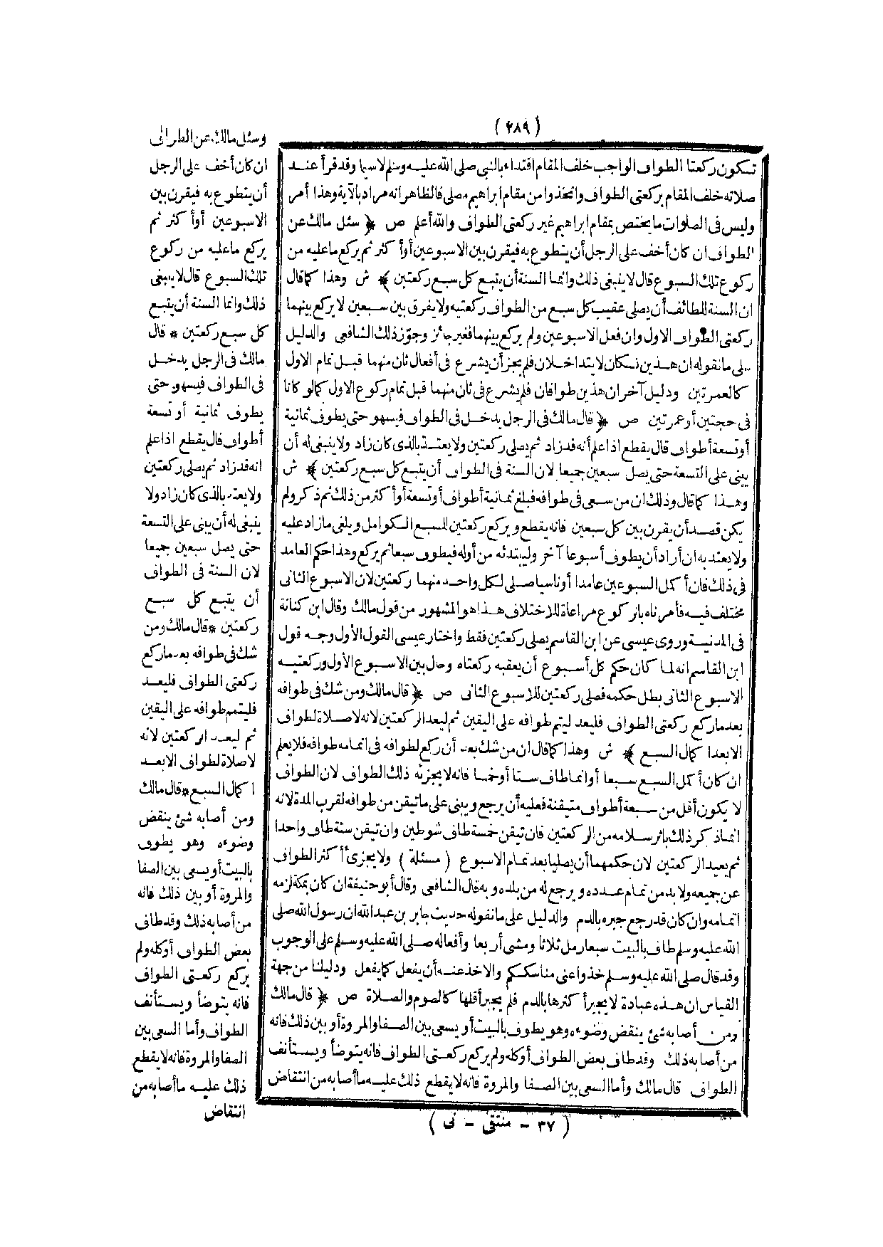 (ش) : وَهَذَا كَمَا قَالَ: إنَّ السُّنَّةَ لِلطَّائِفِ أَنْ يُصَلِّيَ عَقِيبَ كُلِّ سَبْعٍ مِنْ الطَّوَافِ رَكْعَتَيْهِ وَلَا يُفَرِّقُ بَيْنَ سَبْعَيْنِ لَا يَرْكَعُ بَيْنَهُمَا رَكْعَتَيْ الطَّوَافِ الْأَوَّلِ وَإِنْ فَعَلَ الْأُسْبُوعَيْنِ وَلَمْ يَرْكَعْ بَيْنَهُمَا فَغَيْرُ جَائِزٍ وَجَوَّزَ ذَلِكَ الشَّافِعِيُّ وَالدَّلِيلُ عَلَى مَا نَقُولُهُ أَنَّ هَذَيْنِ نُسُكَانِ لَا يَتَدَاخَلَانِ فَلَمْ يَجُزْ أَنْ يَشْرَعَ فِي أَفْعَالِ ثَانٍ مِنْهُمَا قَبْلَ تَمَامِ الْأَوَّلِ كَالْعُمْرَتَيْنِ، وَدَلِيلٌ آخَرُ أَنَّ هَذَيْنِ طَوَافَانِ فَلَمْ يَشْرَعْ فِي ثَانٍ مِنْهُمَا قَبْلَ تَمَامِ رُكُوعِ الْأَوَّلِ كَمَا لَوْ كَانَا فِي حَجَّتَيْنِ أَوْ عُمْرَتَيْنِ.