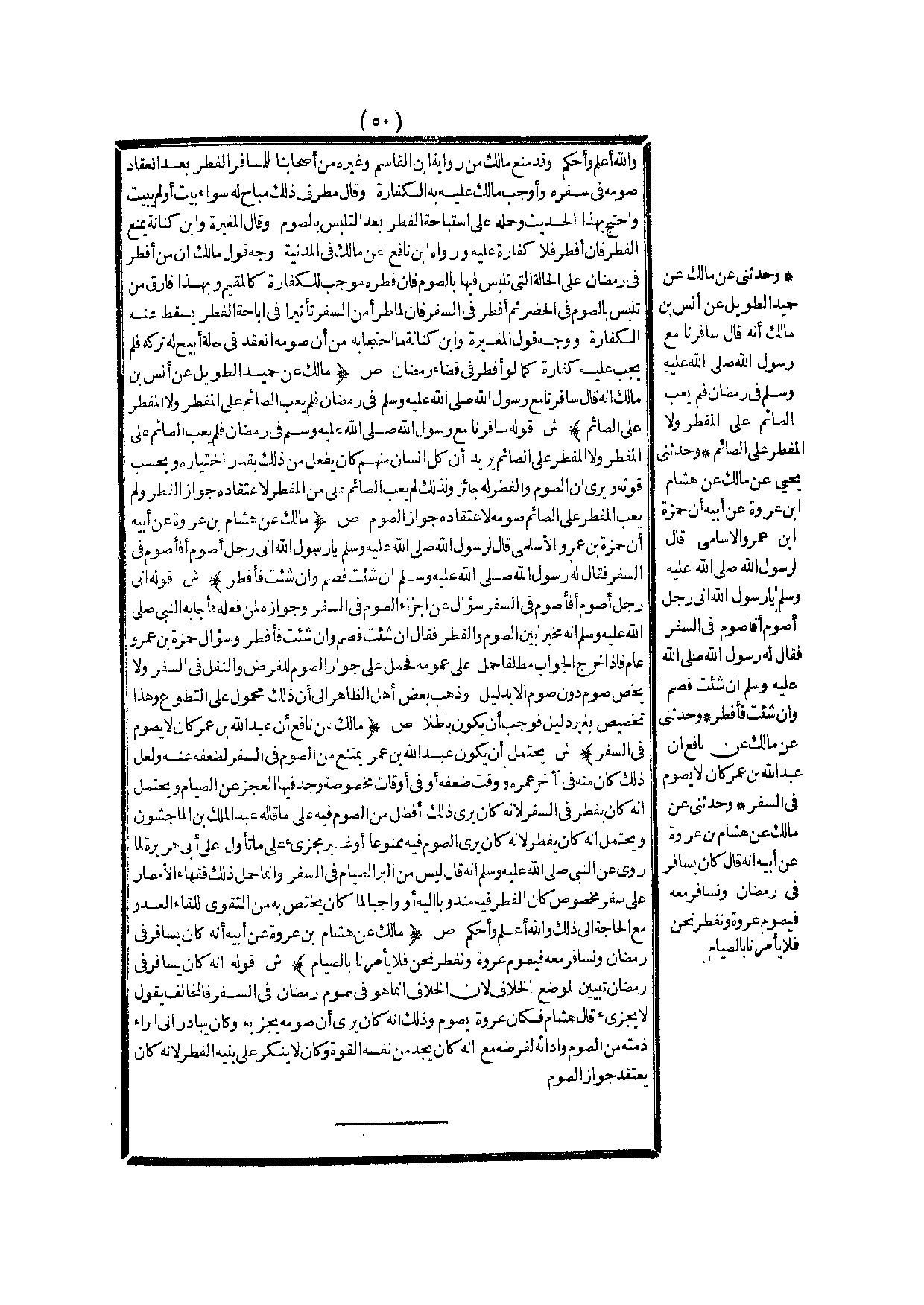 (ص) : (مَالِكٌ عَنْ هِشَامِ بْنِ عُرْوَةَ عَنْ أَبِيهِ أَنَّهُ كَانَ يُسَافِرُ فِي رَمَضَانَ وَنُسَافِرُ مَعَهُ فَيَصُومُ عُرْوَةُ وَنُفْطِرُ نَحْنُ فَلَا يَأْمُرْنَا بِالصِّيَامِ) .