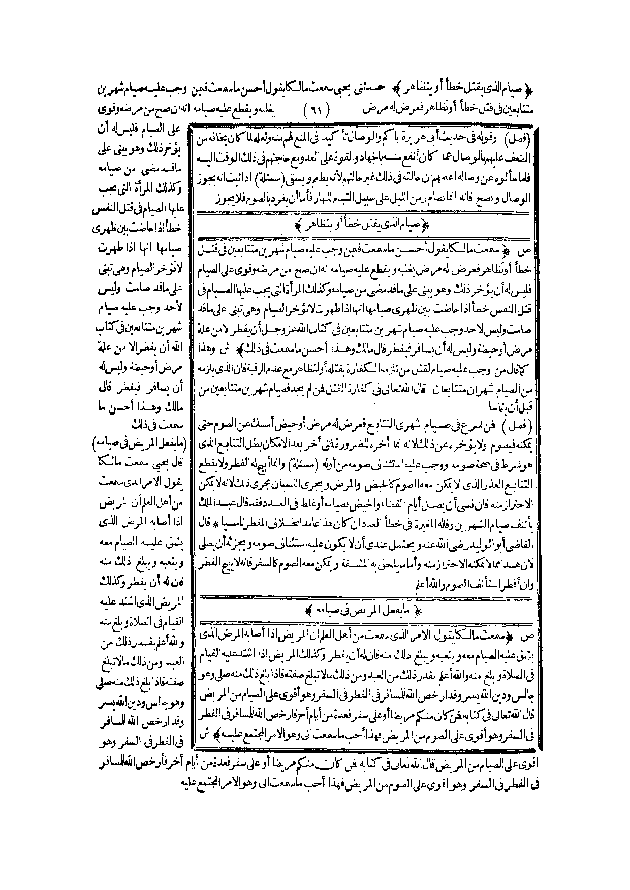 مَا يَفْعَلُ الْمَرِيضُ فِي صِيَامِهِ (ص) : (سَمِعْت مَالِكًا يَقُولُ الْأَمْرُ الَّذِي سَمِعْت مِنْ أَهْلِ الْعِلْمِ أَنَّ الْمَرِيضَ إذَا أَصَابَهُ الْمَرَضُ الَّذِي يَشُقُّ عَلَيْهِ الصِّيَامُ مَعَهُ وَيُتْعِبُهُ وَيَبْلُغُ ذَلِكَ مِنْهُ فَإِنَّ لَهُ أَنْ يُفْطِرَ، وَكَذَلِكَ الْمَرِيضُ إذَا اشْتَدَّ عَلَيْهِ الْقِيَامُ فِي الصَّلَاةِ وَبَلَغَ مِنْهُ، وَاَللَّهُ أَعْلَمُ بِقَدْرِ ذَلِكَ مِنْ الْعَبْدِ وَمِنْ ذَلِكَ مَا لَا تَبْلُغُ صِفَتُهُ فَإِذَا بَلَغَ ذَلِكَ مِنْهُ صَلَّى وَهُوَ جَالِسٌ وَدِينُ اللَّهِ يُسْرٌ وَقَدْ أَرْخَصَ اللَّهُ لِلْمُسَافِرِ فِي الْفِطْرِ فِي السَّفَرِ وَهُوَ أَقْوَى عَلَى الصِّيَامِ مِنْ الْمَرِيضِ قَالَ اللَّهُ تَعَالَى فِي كِتَابِهِ {فَمَنْ كَانَ مِنْكُمْ مَرِيضًا أَوْ عَلَى سَفَرٍ فَعِدَّةٌ مِنْ أَيَّامٍ أُخَرَ} [البقرة: 184] فَأَرْخَصَ اللَّهُ لِلْمُسَافِرِ فِي الْفِطْرِ فِي السَّفَرِ وَهُوَ أَقْوَى عَلَى الصَّوْمِ مِنْ الْمَرِيضِ فَهَذَا أَحَبُّ مَا سَمِعْت إلَيَّ وَهُوَ الْأَمْرُ الْمُجْتَمَعُ عَلَيْهِ) .