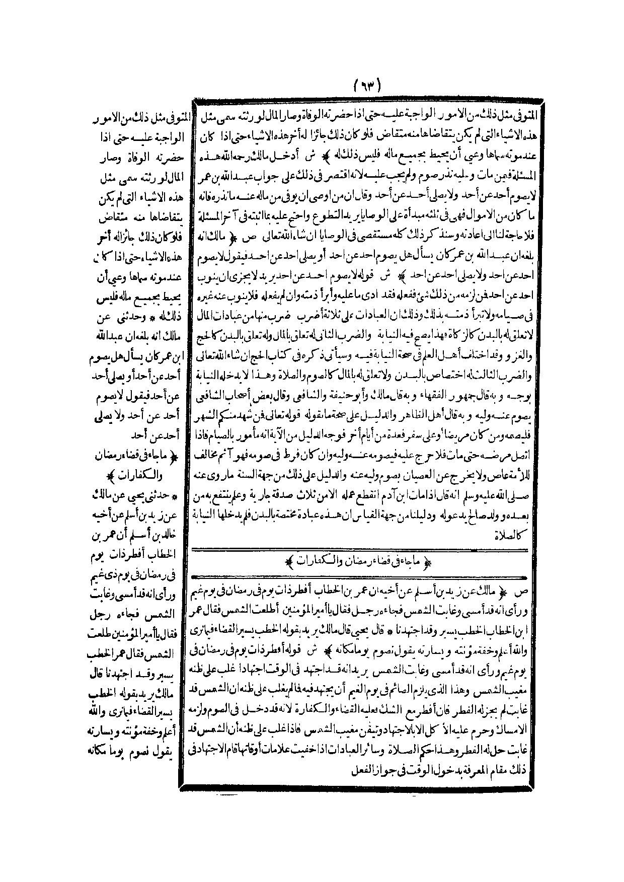 مَا جَاءَ فِي قَضَاءِ رَمَضَانَ وَالْكَفَّارَاتِ (ص) : (مَالِكٌ عَنْ زَيْدِ بْنِ أَسْلَمَ عَنْ أَخِيهِ أَنَّ عُمَرَ بْنَ الْخَطَّابِ أَفْطَرَ ذَاتَ يَوْمٍ فِي رَمَضَانَ فِي يَوْمِ غَيْمٍ وَرَأَى أَنَّهُ قَدْ أَمْسَى وَغَابَتْ الشَّمْسُ فَجَاءَهُ رَجُلٌ فَقَالَ يَا أَمِيرَ الْمُؤْمِنِينَ أَطَلَعَتْ الشَّمْسُ فَقَالَ عُمَرُ بْنُ الْخَطَّابِ الْخَطْبُ يَسِيرٌ وَقَدْ اجْتَهَدْنَا قَالَ يَحْيَى قَالَ مَالِكٌ يُرِيدُ بِقَوْلِهِ " الْخَطْبُ يَسِيرٌ " الْقَضَاءَ فِيمَا نَرَى، وَاَللَّهُ أَعْلَمُ وَخِفَّةَ مُؤْنَتِهِ وَيَسَارَتَهُ، يَقُولُ نَصُومُ يَوْمًا مَكَانَهُ)