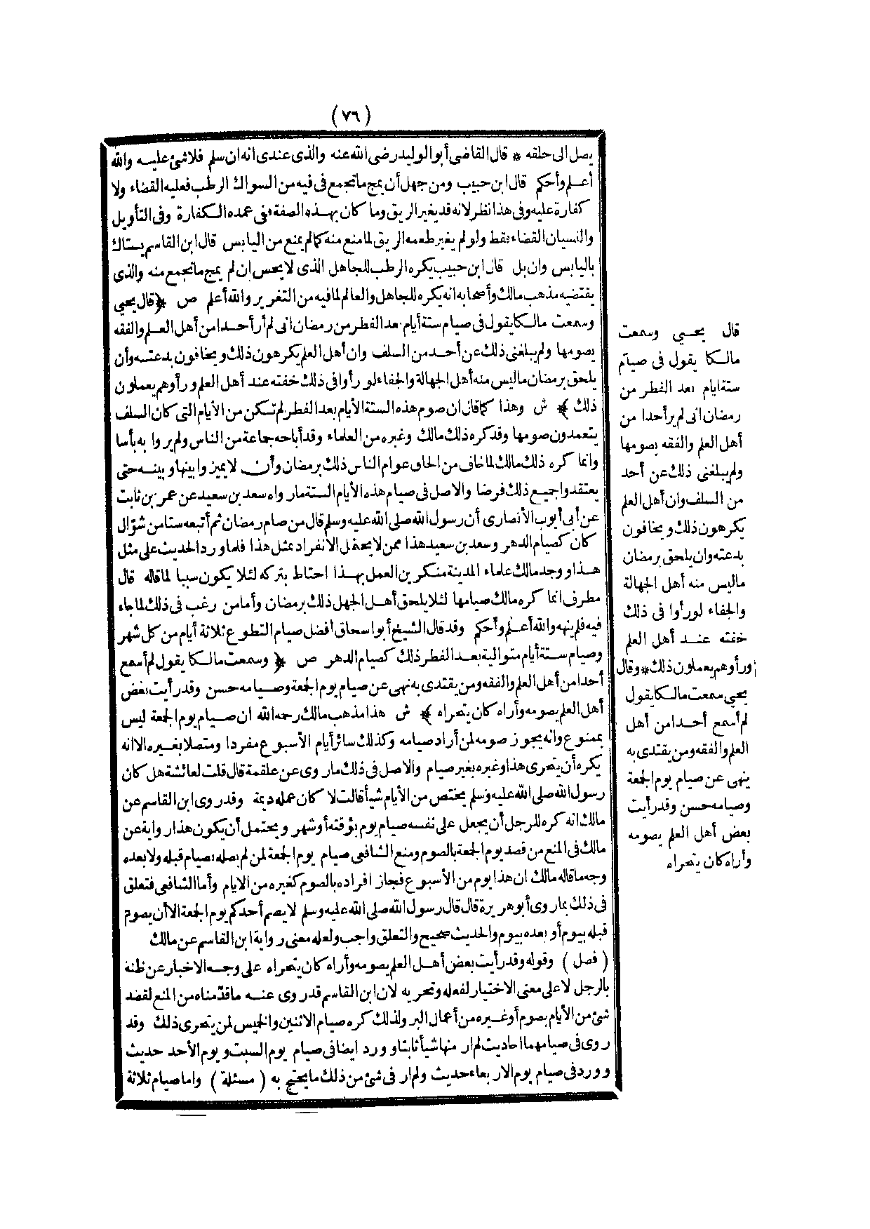 (ص) : (قَالَ يَحْيَى وَسَمِعْت مَالِكًا يَقُولُ فِي صِيَامِ سِتَّةِ أَيَّامٍ بَعْدَ الْفِطْرِ مِنْ رَمَضَانَ إنِّي لَمْ أَرَ أَحَدًا مِنْ أَهْلِ الْعِلْمِ وَالْفِقْهِ يَصُومُهَا وَلَمْ يَبْلُغْنِي ذَلِكَ عَنْ أَحَدٍ مِنْ السَّلَفِ وَأَنَّ أَهْلَ الْعِلْمِ يَكْرَهُونَ ذَلِكَ وَيَخَافُونَ بِدْعَتَهُ وَأَنْ يُلْحِقَ بِرَمَضَانَ مَا لَيْسَ مِنْهُ أَهْلُ الْجَهَالَةِ وَالْجَفَاءِ لَوْ رَأَوْا فِي ذَلِكَ خِفَّتَهُ عِنْدَ أَهْلِ الْعِلْمِ وَرَأَوْهُمْ يَعْمَلُونَ ذَلِكَ) .