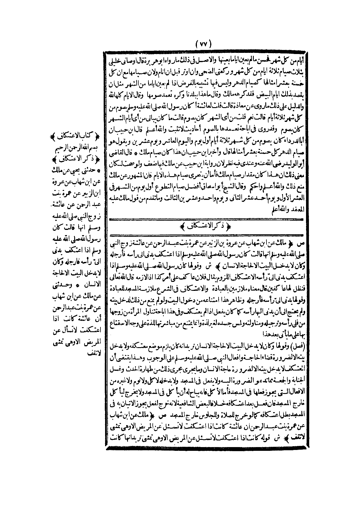 ذِكْرُ الِاعْتِكَافِ (ص) : (مَالِكٌ عَنْ ابْنِ شِهَابٍ عَنْ عُرْوَةَ بْنِ الزُّبَيْرِ عَنْ عَمْرَةَ بِنْتِ عَبْدِ الرَّحْمَنِ عَنْ عَائِشَةَ زَوْجِ النَّبِيِّ - صَلَّى اللَّهُ عَلَيْهِ وَسَلَّمَ - أَنَّهَا قَالَتْ «كَانَ رَسُولُ اللَّهِ - صَلَّى اللَّهُ عَلَيْهِ وَسَلَّمَ - إذَا اعْتَكَفَ يُدْنِي إلَيَّ رَأْسَهُ فَأُرَجِّلُهُ وَكَانَ لَا يَدْخُلُ الْبَيْتَ إلَّا لِحَاجَةِ الْإِنْسَانِ» ) .