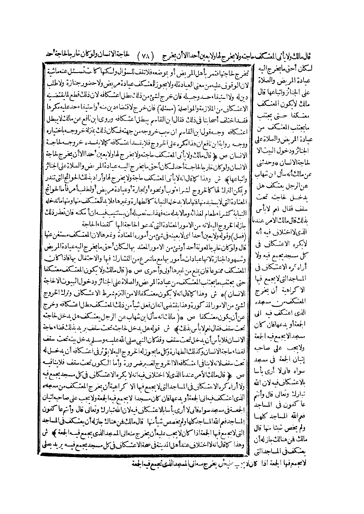 (ص) :. (قَالَ مَالِكٌ وَلَا يَكُونُ الْمُعْتَكِفُ مُعْتَكِفًا حَتَّى يَجْتَنِبَ مَا يَجْتَنِبُ الْمُعْتَكِفُ مِنْ عِيَادَةِ الْمَرِيضِ وَالصَّلَاةِ عَلَى الْجَنَائِزِ وَدُخُولِ الْبُيُوتِ إلَّا لِحَاجَةِ الْإِنْسَانِ) .