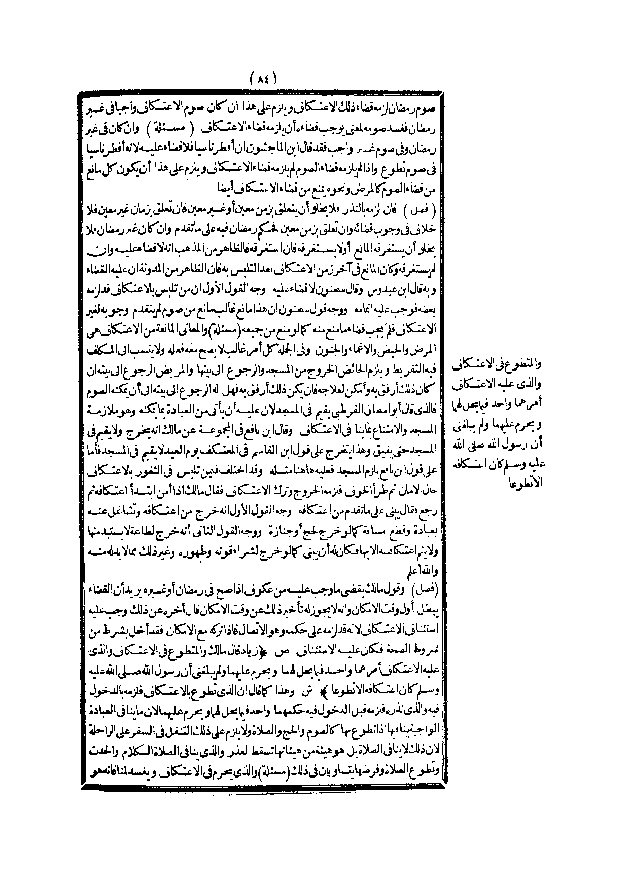 وَقَوْلُ مَالِكٍ يَقْضِي مَا وَجَبَ عَلَيْهِ مِنْ عُكُوفٍ إذَا صَحَّ فِي رَمَضَانَ أَوْ غَيْرِهِ يُرِيدُ أَنَّ الْقَضَاءَ يَبْطُلُ أَوَّلَ وَقْتِ الْإِمْكَانِ وَأَنَّهُ لَا يَجُوزُ لَهُ تَأْخِيرُ ذَلِكَ عَنْ وَقْتِ الْإِمْكَانِ فَإِنْ أَخَّرَهُ عَنْ ذَلِكَ وَجَبَ عَلَيْهِ اسْتِئْنَافُ الِاعْتِكَافِ؛ لِأَنَّهُ قَدْ لَزِمَهُ عَلَى حُكْمِهِ وَهُوَ الِاتِّصَالُ فَإِذَا تَرَكَهُ مَعَ الْإِمْكَانِ فَقَدْ أَخَلَّ بِشَرْطٍ مِنْ شُرُوطِ الصِّحَّةِ فَكَانَ عَلَيْهِ الِاسْتِئْنَافُ.