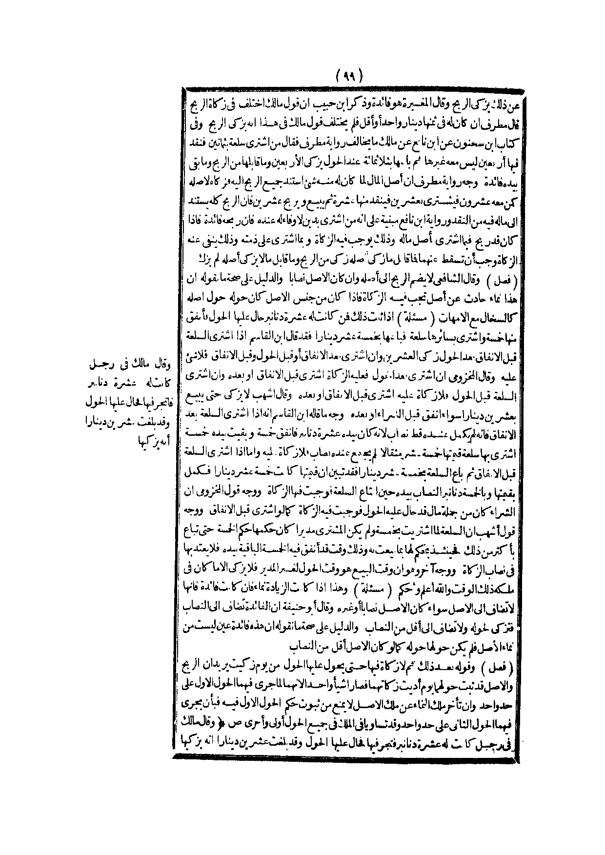 (ص) : (وَقَالَ مَالِكٌ فِي رَجُلٍ كَانَتْ لَهُ عَشَرَةُ دَنَانِيرَ فَتَجَرَ فِيهَا فَحَالَ عَلَيْهَا الْحَوْلُ، وَقَدْ بَلَغَتْ عِشْرِينَ دِينَارًا إنَّهُ يُزَكِّيهَا