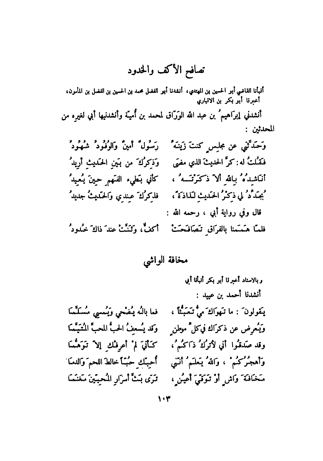 أنبأنا القاضي أبو الحسين بن المهتدي، أنشدنا أبو الفضل محمد بن الحسين بن الفضل بن المأمون، أخبرنا أبو بكر بن الأنباري: أنشدني إبراهيم بن عبد الله الوراق لمحمد بن أمية وأنشدنيها أبي لغيره من المحدثين: