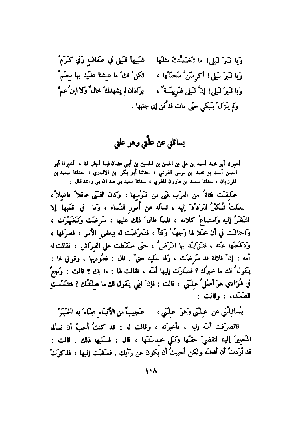 أخبرنا أبو محمد أحمد بن علي بن الحسن بن الحسين بن أبي عثمان فيما أجاز لنا، أخبرنا أبو الحسن أحمد بن محمد بن موسى القرشي، حدثنا أبو بكر بن الأنباري، حدثنا محمد بن المرزبان، حدثنا محمد بن هارون المقري، حدثنا سعيد بن عبد الله بن راشد قال: علقت فتاةٌ من العرب فتى من قومها، وكان الفتى عاقلاً فاضلاً، فجعلت تكثر التردد إليه، تسأله عن أمور النساء، وما في قلبها إلا النظر إليه واستماع كلامه، فلما طال ذلك عليها، مرضت وتغيرت، واحتالت في أن خلا لها وجهه وقتاً، فتعرضت له ببعض الأمر، فصرفها، ودفعها عنه، فتزايد بها المرض، حتى سقطت على الفراش، فقالت له أمه: إن فلانة قد مرضت، ولها علينا حق. قال: فعوديها، وقولي لها: يقول لك ما خبرك؟ فصارت إليها أمه، فقالت لها: ما بك؟ قالت: وجع في فؤادي هو أصل علتي، قالت: فإن ابني يقول لك ما علتك؟ فتنفست الصعداء، وقالت: