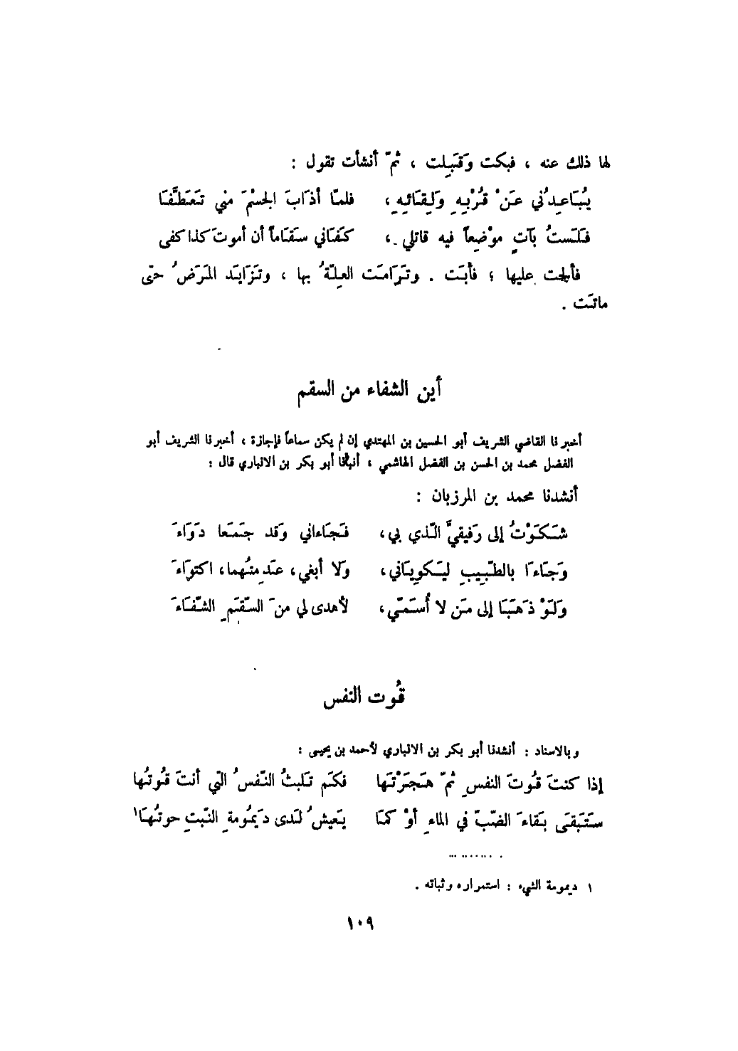 أخبرنا القاضي الشريف أبو الحسين بن المهتدي إن لم يكن سماعاً فإجازة، أخبرنا الشريف أبو الفضل محمد بن الحسن بن الفضل الهاشمي، أنبأنا أبو بكر بن الأنباري قال: أنشدنا محمد بن المرزبان: