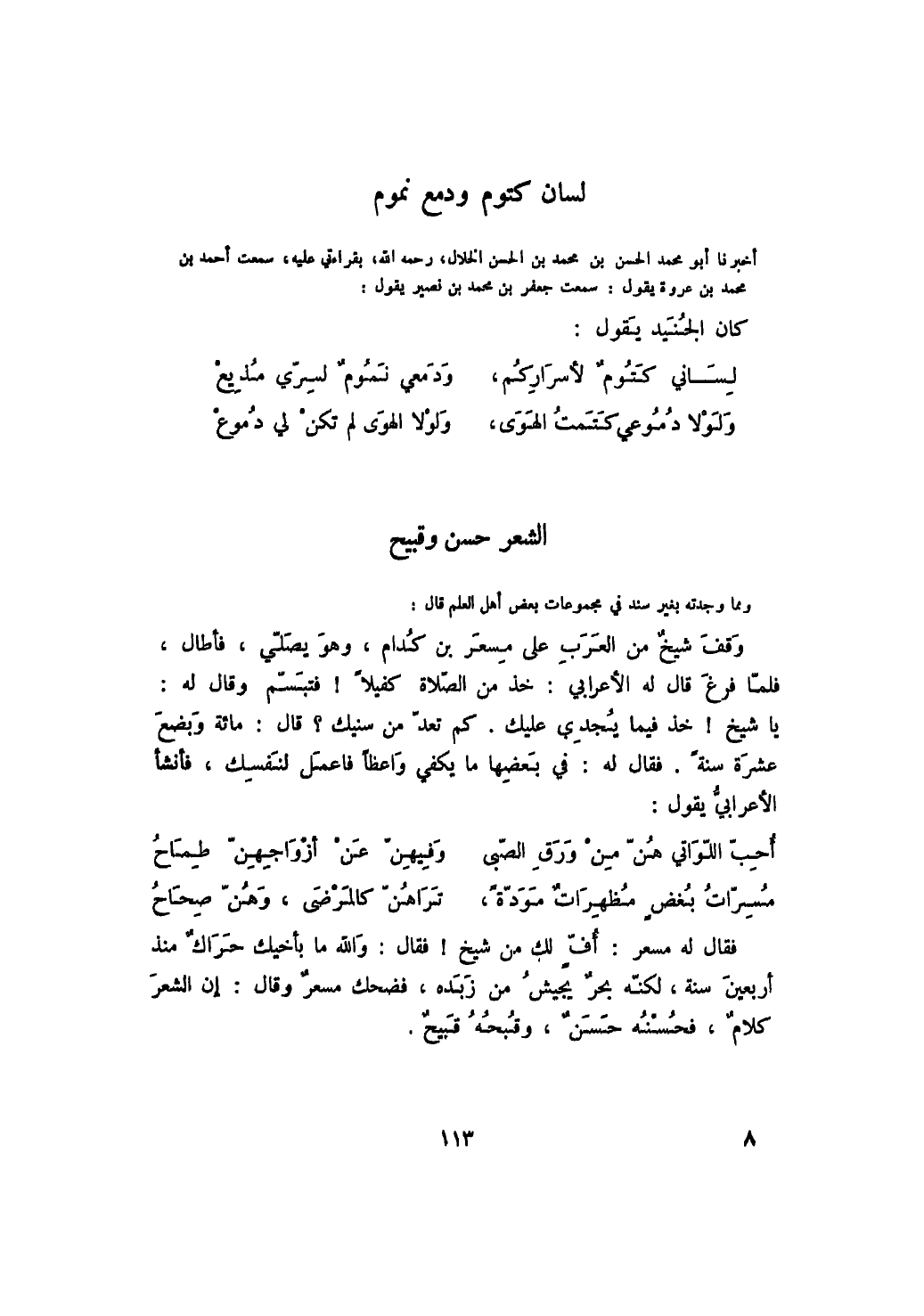 فقال له مسعر: أف لك من شيخ! فقال: والله ما بأخيك حراك منذ أربعين سنة، لكنه بحر يجيش من زبده، فضحك مسعر وقال: إن الشعر كلام، فحسنه حسن، وقبحه قبيح.
