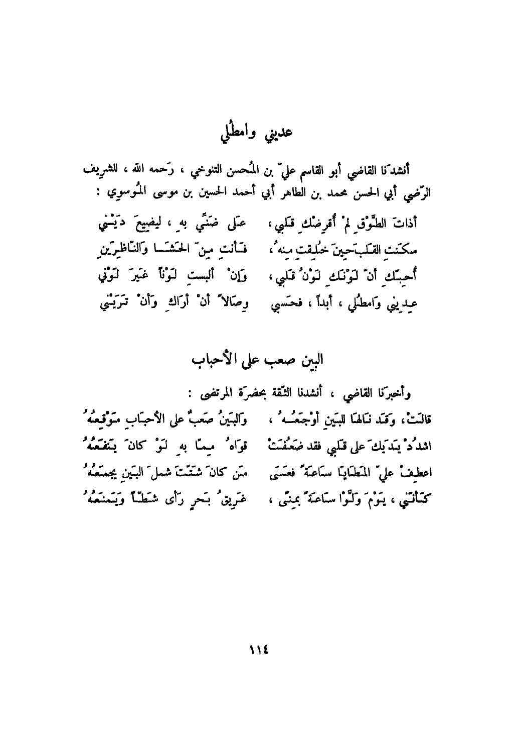 أنشدنا القاضي أبو القاسم علي بن المحسن التنوخي، رحمه الله تعالى، للشريف الرضي أبي الحسن محمد بن الطاهر أبي أحمد الحسين بن موسى الموسوي:
