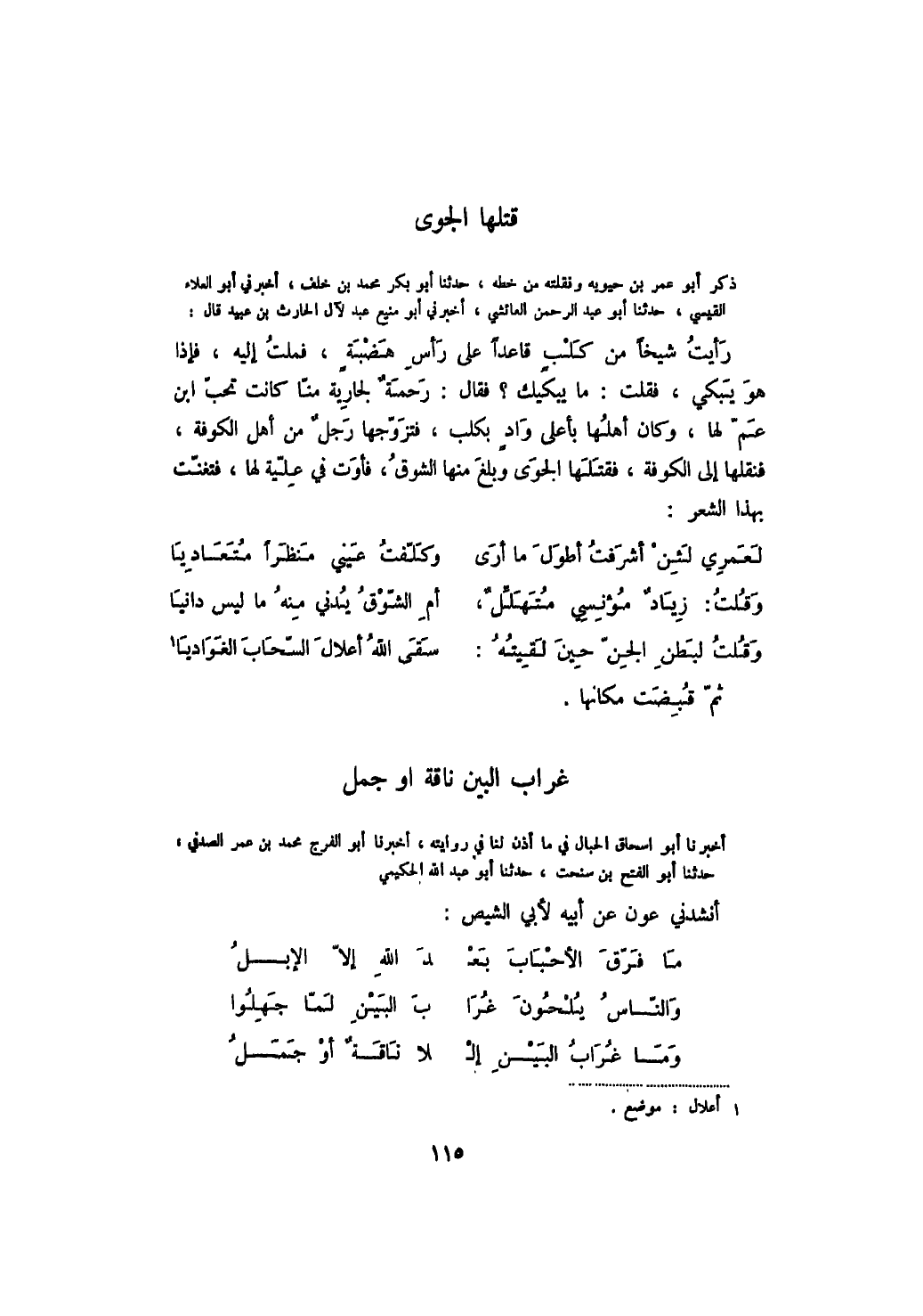 ذكر أبو عمر بن حيويه ونقلته من خطه، حدثنا أبو بكر محمد بن خلف، أخبرني أبو العلاء القيسي، حدثنا أبو عبد الرحمن العائشي، أخبرني أبو منيع عبد لآل الحارث بن عبيد قال: رأيت شيخاً من كلب قاعداً على رأس هضبةٍ، فملت إليه، فإذا هو يبكي، فقلت: ما يبكيك؟ فقال: رحمةٌ لجارية منا كانت تحب ابن عم لها، وكان أهلها بأعلى واد بكلب، فتزوجها رجل من أهل الكوفة، فنقلها إلى الكوفة، فقتلها الجوى وبلغ منها الشوق، فأوت في علية لها، فتغنت بهذا الشعر: