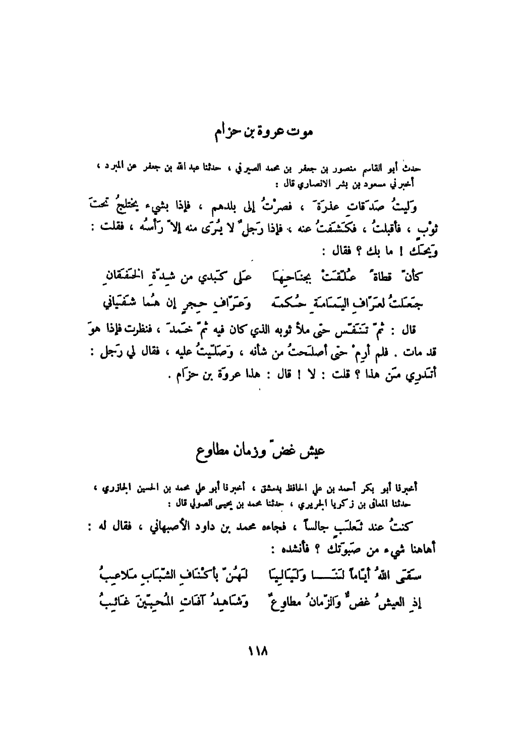 حدث أبو القاسم منصور بن جعفر بن محمد الصيرفي، حدثنا عبد الله بن جعفر عن المبرد، أخبرني مسعود بن بشر الأنصاري قال: وليت صدقات عذرة، فصرت إلى بلدهم، فإذا بشيء يختلج تحت ثوب، فأقبلت، فكشفت عنه، فإذا رجل لا يرى إلا رأسه، فقلت: ويحك! ما بك؟ فقال: