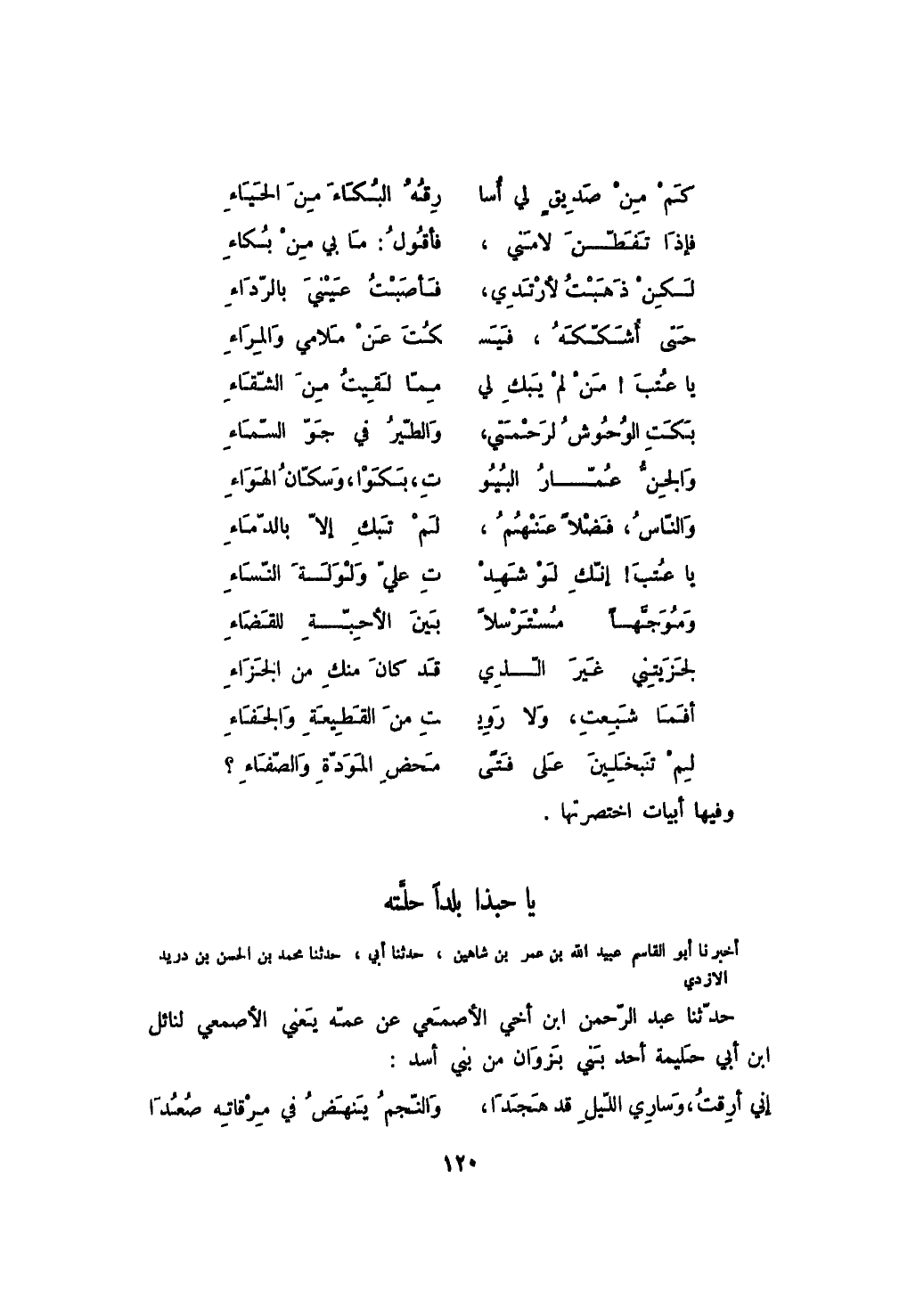 أخبرنا أبو القاسم عبيد الله بن عمر بن شاهين، حدثنا أبي، حدثنا محمد بن الحسن بن دريد الأزدي: حدثنا عبد الرحمن ابن أخي الأصمعي عن عمه يعني الأصمعي لنائل ابن أبي حليمة أحد بني بزوان من بني أسد: