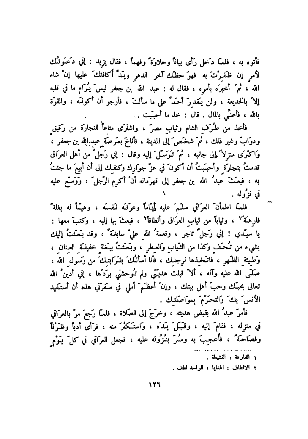 فأمر عبد الله بقبض هديته، وخرج إلى الصلاة، فلما رجع مر بالعراقي في منزله، فقام إليه، وقبل يده، واستكثر منه، فرأى أدباً وظرفاً وفصاحةً، فأعجب به وسر بنزوله عليه، فجعل العراقي في كل يوم