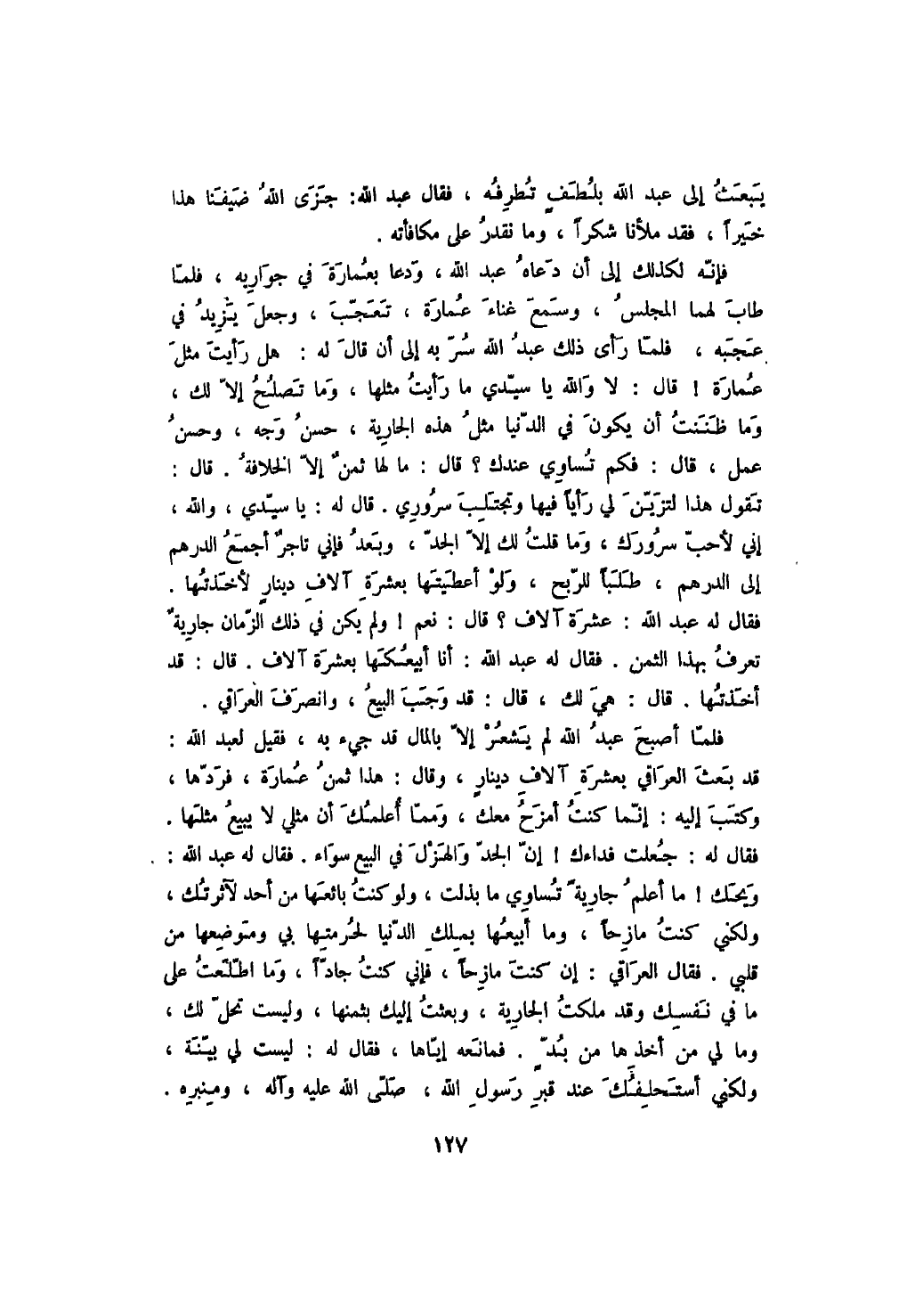 فلما أصبح عبد الله لم يشعر إلا بالمال قد جيء به، فقيل لعبد الله: قد بعث العراقي بعشرة آلاف دينار، وقال: هذا ثمن عمارة، فردها، وكتب إليه: إنما كنت أمزح معك، ومما أعلمك أن مثلي لا يبيع مثلها. فقال له: جعلت فداءك! إن الجد والهزل في البيع سواء. فقال له عبد الله: ويحك! ما أعلم جاريةً تساوي ما بذلت، ولو كنت بائعها من أحد لآثرتك، ولكني كنت مازحاً، وما أبيعها بملك الدنيا لحرمتها بي وموضعها من قلبي. فقال العراقي: إن كنت مازحاً، فإني كنت جاداً، وما اطلعت على ما في نفسك وقد ملكت الجارية، وبعثت إليك بثمنها، وليس تحل لك، وما لي من أخذها من بد. فمانعه إياها، فقال له: ليست لي بينة، ولكني أستحلفك عند قبر رسول الله صلى الله عليه وسلم، ومنبره.