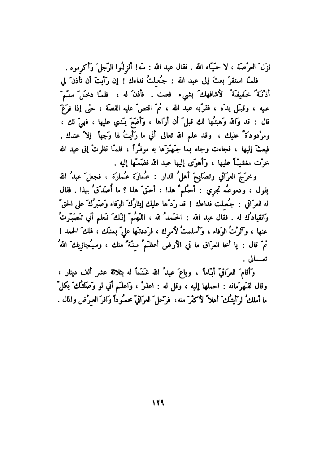 وخرج العراقي وتصايح أهل الدار: عمارة عمارة، فجعل عبد الله يقول، ودموعه تجري: أحلم هذا، أحق هذا؟ ما أصدق بهذا. فقال له العراقي: جعلت فداءك! قد ردها عليك إيثارك الوفاء وصبرك على الحق وانقيادك له. فقال عبد الله: الحمد لله، اللهم إنك تعلم أني تصبرت عنها، وآثرت الوفاء، وأسلمت لأمرك، فرددتها علي بمنك، فلك الحمد! ثم قال: يا أخا العراق ما في الأرض أعظم منةًَ منك، وسيجازيك الله تعالى.