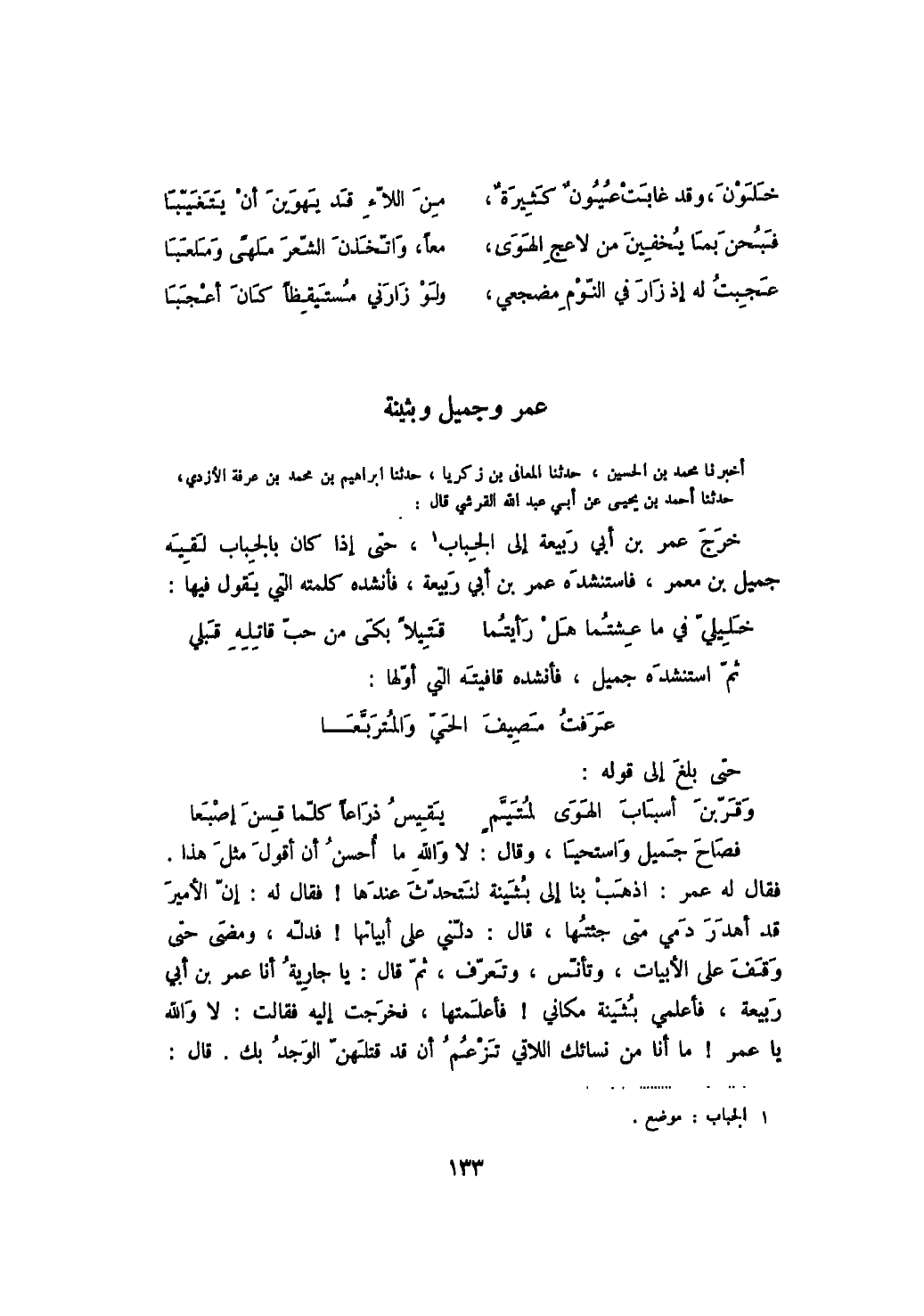 أخبرنا محمد بن الحسين، حدثنا المعافى بن زكريا، حدثنا إبراهيم بن محمد بن عرفة الأزدي، حدثنا أحمد بن يحيى عن أبي عبد الله القرشي قال: خرج عمر بن أبي ربيعة إلى الجباب، حتى إذا كان بالجباب لقيه جميل بن معمر، فاستنشده عمر بن أبي ربيعة، فأنشده كلمته التي يقول فيها: