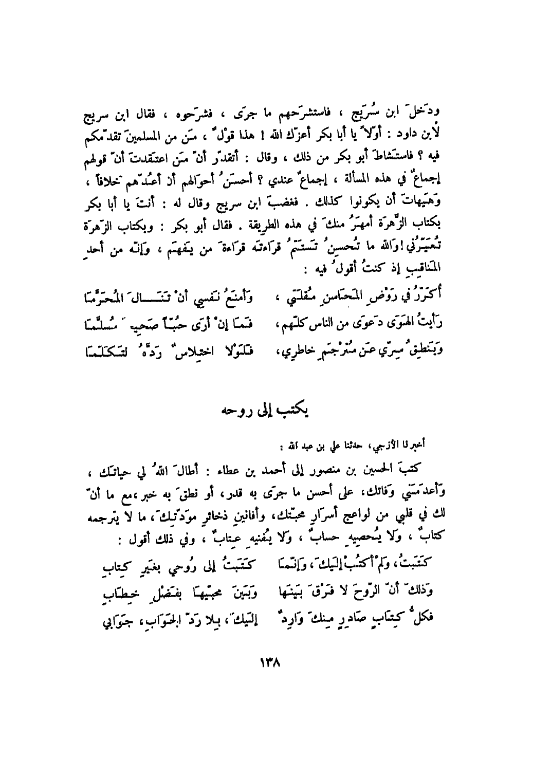 أخبرنا الأزجي، حدثنا علي بن عبد الله: كتب الحسين بن منصور إلى أخبرنا بن عطاء: أطال الله لي حياتك، وأعدمني وفاتك، على ما أحسن ما جرى به قدر، أو نطق به خبر، مع ما أنّ لك في قلبي من لواعج أسرار محبتك، وأفانين ذخائر مودتك، ما لا يترجمه كتاب، ولا يحصيه حساب، ولا يفنيه عتاب، وفي ذلك أقول: