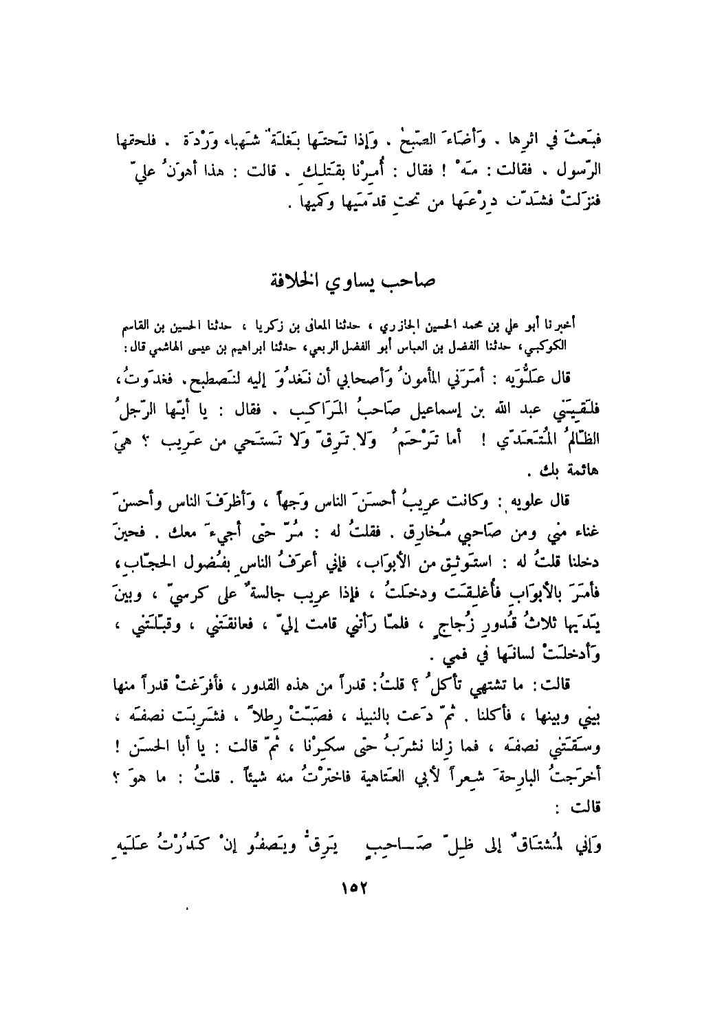قالت: ما تشتهي تأكل؟ قلت: قدراً من هذه القدور، فأفرغت قدراً منها بيني وبينها، فأكلنا. ثم دعت بالنبيذ، فصبت رطلاً، فشربت نصفه، وسقتني نصفه، فما زلنا نشرب حتى سكرنا، ثم قالت: يا أبا الحسن! أخرجت البارحة شعراً لأبي العتاهية فاخترت منه شيئاً. قلت: ما هو؟ قالت: