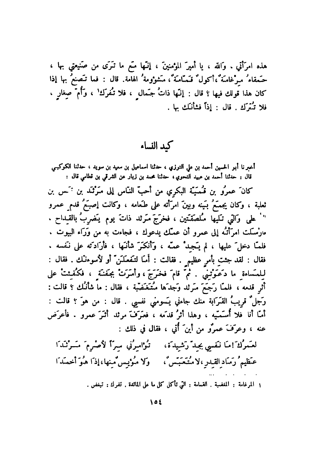 أخبرنا أبو الحسين أحمد بن علي التوزي، حدثنا إسماعيل بن سعيد بن سويد، حدثنا الكوكبي قال: حدثنا أحمد بن عبيد النحوي، حدثنا محمد بن زبار عن الشرقي بن قطامي قال: كان عمرو بن قمية البكري من أحب الناس إلى مرثد بن قيس بن ثعلبة، وكان يجمع بينه وبين امرأته على طعامه، وكانت إصبع قدم عمرو الوسطى والتي تليها ملصقتين، فخرج مرثد ذات يوم يضرب بالقداح، فأرسلت امرأته إلى عمرو أن عمك يدعوك، فجاءت به من وراء البيوت، فلما دخل عليها، لم يجد عنه، وأنكر شأنها، فأرادته على نفسه، فقال: لقد جئت بأمر عظيم. فقالت: أما لتفعلن أو لأسوءنك. فقال: للمساءة ما دعوتني. ثم قام فخرج، وأمرت بجفنة، فكفئت على أثر قدمه، فلما رجع مرثد وجدها متغضبة، فقال: ما شأنك؟ قالت: رجل قريب القرابة منك جاءني يسومني نفسي. قال: من هو؟ قالت: أما أنا فلا أسميه، وهذا أثر قدمه، فعرف مرثد أثر عمرو، فأعرض عنه، وعرف عمرو من أين أتي، فقال في ذلك:
