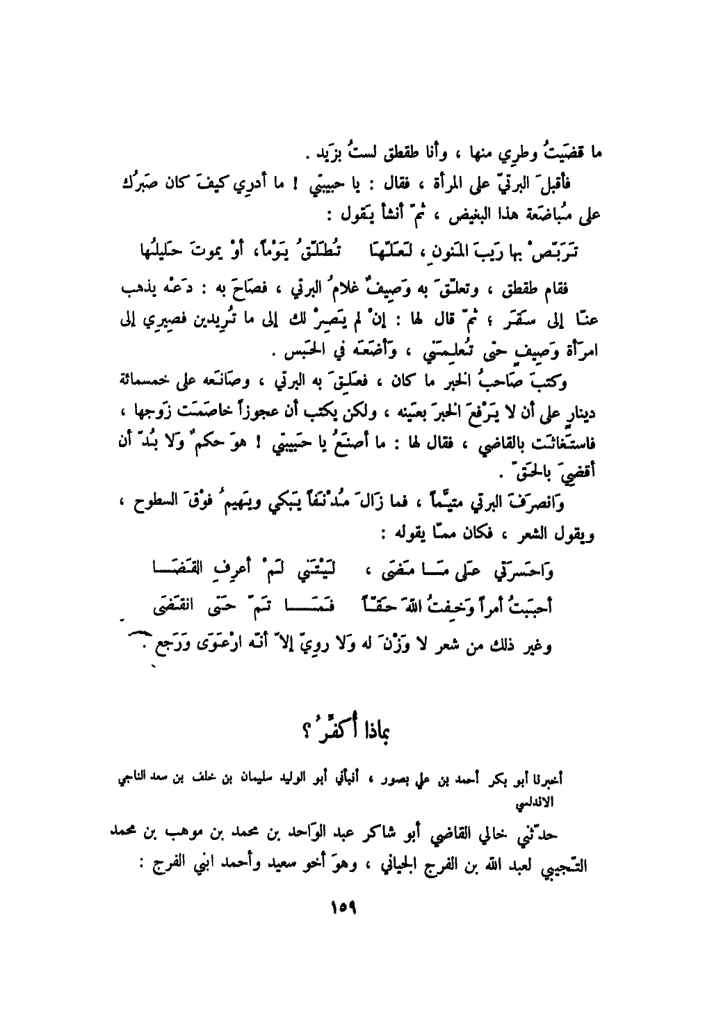 ما قضيت وطري منها، وأنا طقطق لست بزيد. فأقبل البرتي على المرأة، فقال: يا حبيبتي! ما أدري كيف كان صبرك على مباضعة هذا البغيض، ثم أنشأ يقول: