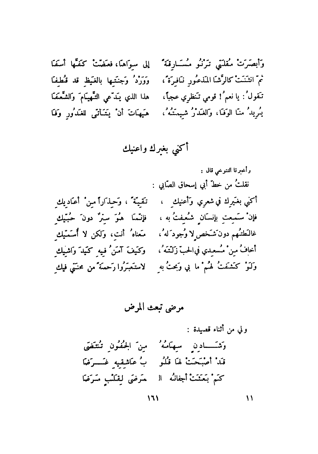 وأخبرنا التنوخي قال: تقلت من خط أبي إسحق الصابي: