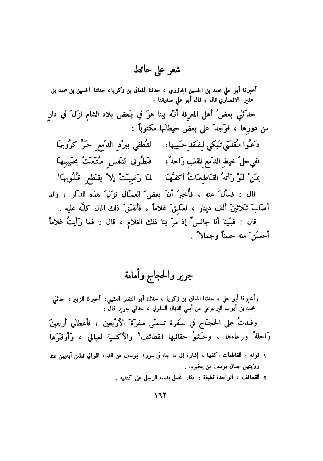 أخبرنا أبو علي محمد بن الحسين الجازري، حدثنا المعافى بن زكريا، حدثنا الحسين بن محمد بن عفير الأنصاري قال: قال أبو علي صديقنا: حدثني بعض أهل المعرفة أنه بينا هو في بعض بلاد الشام نزل في دار من دورها، فوجد على بعض حيطانها مكتوباً: