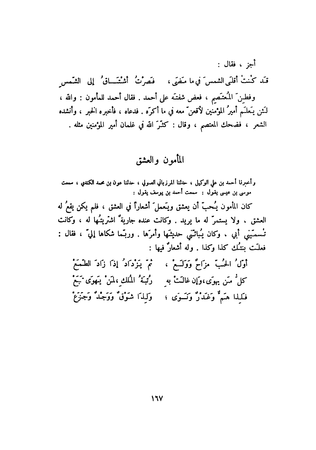 وأخبرنا أحمد بن علي الوكيل، حدثنا المرزباني الصولي، حدثنا عون بن محمد الكندي، سمعت موسى بن عيسى يقول: سمعت أحمد بن يوسف يقول: كان المأمون يحب أن يعشق ويعمل أشعاراً في العشق، فلم يكن يقع له العشق، ولا يستمر له ما يريد. وكانت عنده جاريةٌ اشتريتها له، وكانت تسميني أبي، وكان يباثّني حديثها وأمرها. وربما شكاها إلي، فقال: فعلت بنتك كذا وكذا. وله أشعار فيها: