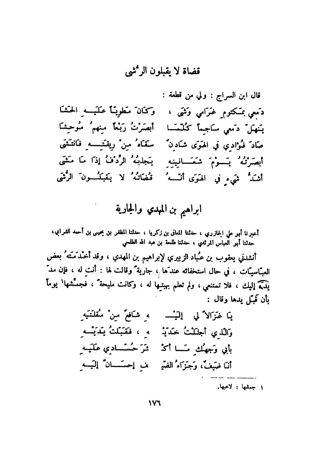 أخبرنا أبو علي الجازري، حدثنا المعافى بن زكريا، حدثنا المظفر بن يحيى بن أخبرنا الشرابي، حدثنا أبو العباس المرثدي، حدثنا طلحة بن عبد الله الطلحي أنشدني يعقوب بن عباد الزبيري لإبراهيم بن المهدي، وقد أخدمته بعض العباسيات، في حال استخفائه عندها، جاريةً وقالت لها: أنت له، فإن مد يده إليك، فلا تمتنعي، ولم تعلم بهبتها له، وكانت مليحةً، فجمشها يوماً بأن قبل يدها وقال: