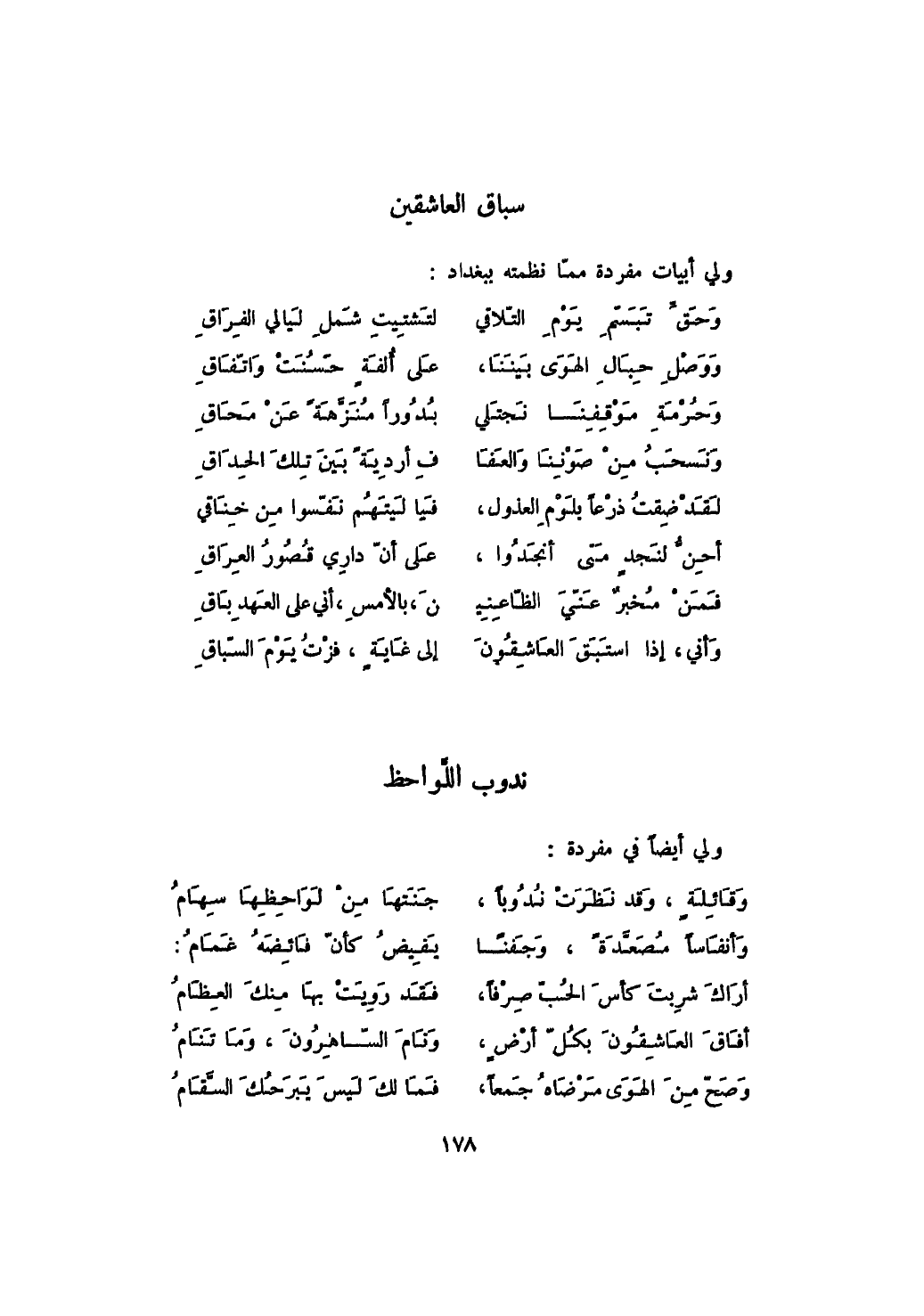 وَأني، إذا استَبَقَ العَاشِقُونَ ... إلى غَايَةٍ، فزْتُ يَوْمَ السّباقِ