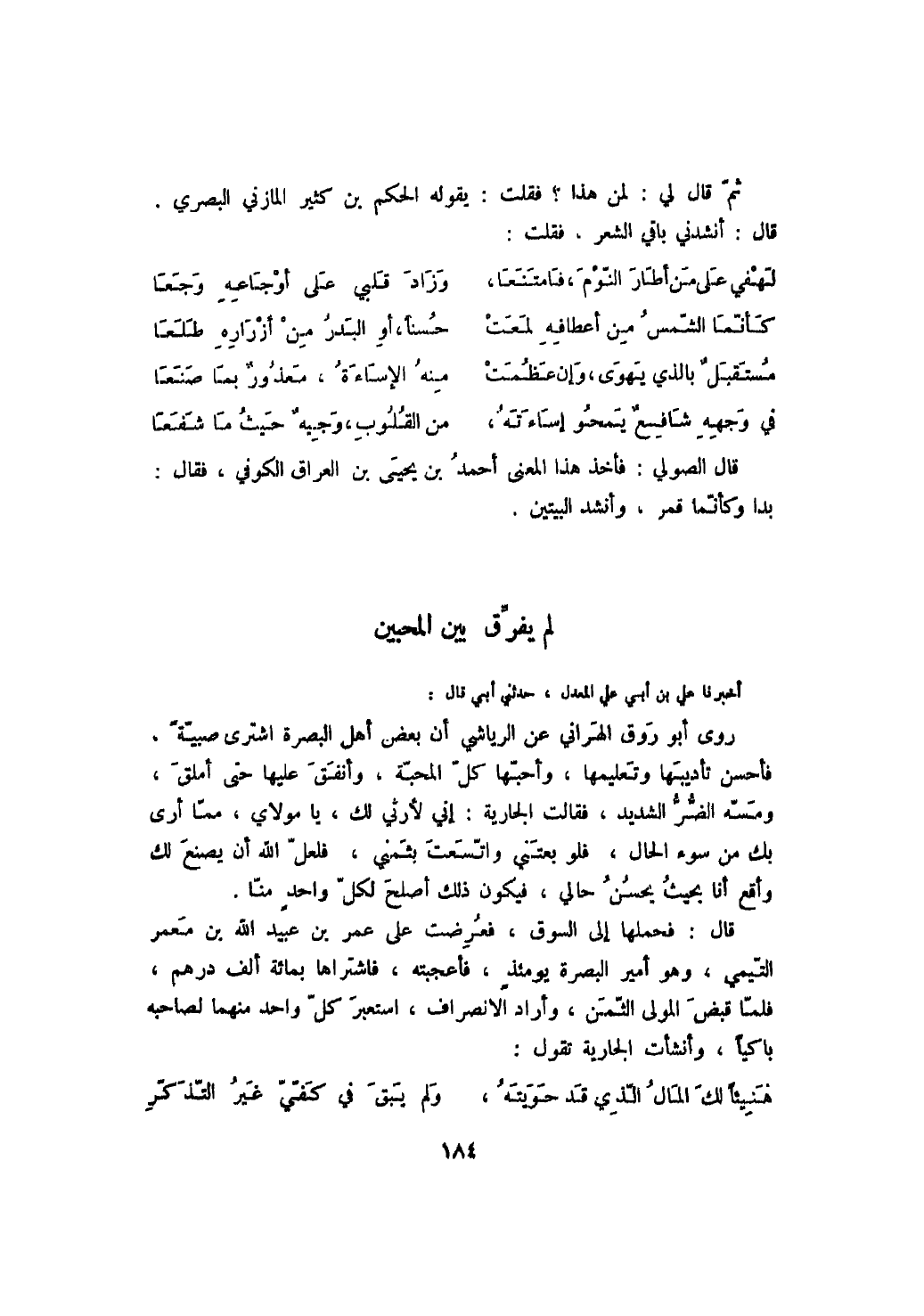 أخبرنا علي بن أحمد علي المعدل، حدثني أبي قال: روى أبو روق الهراني عن الرياشي أن بعض أهل البصرة اشترى صبيةً، فأحسن تأديبها وتعليمها، وأحبها كل المحبة، وأنفق عليها حتى أملق، ومسه الضر الشديد، فقالت الجارية: إني لأرثي لك، يا مولاي، مما أرى بك من سوء الحال، فلو بعتني واتسعت بثمني، فلعل الله أن يصنع لك وأقع أنا بحيث يحسن حالي، فيكون ذلك أصلح لكل واحد منا.