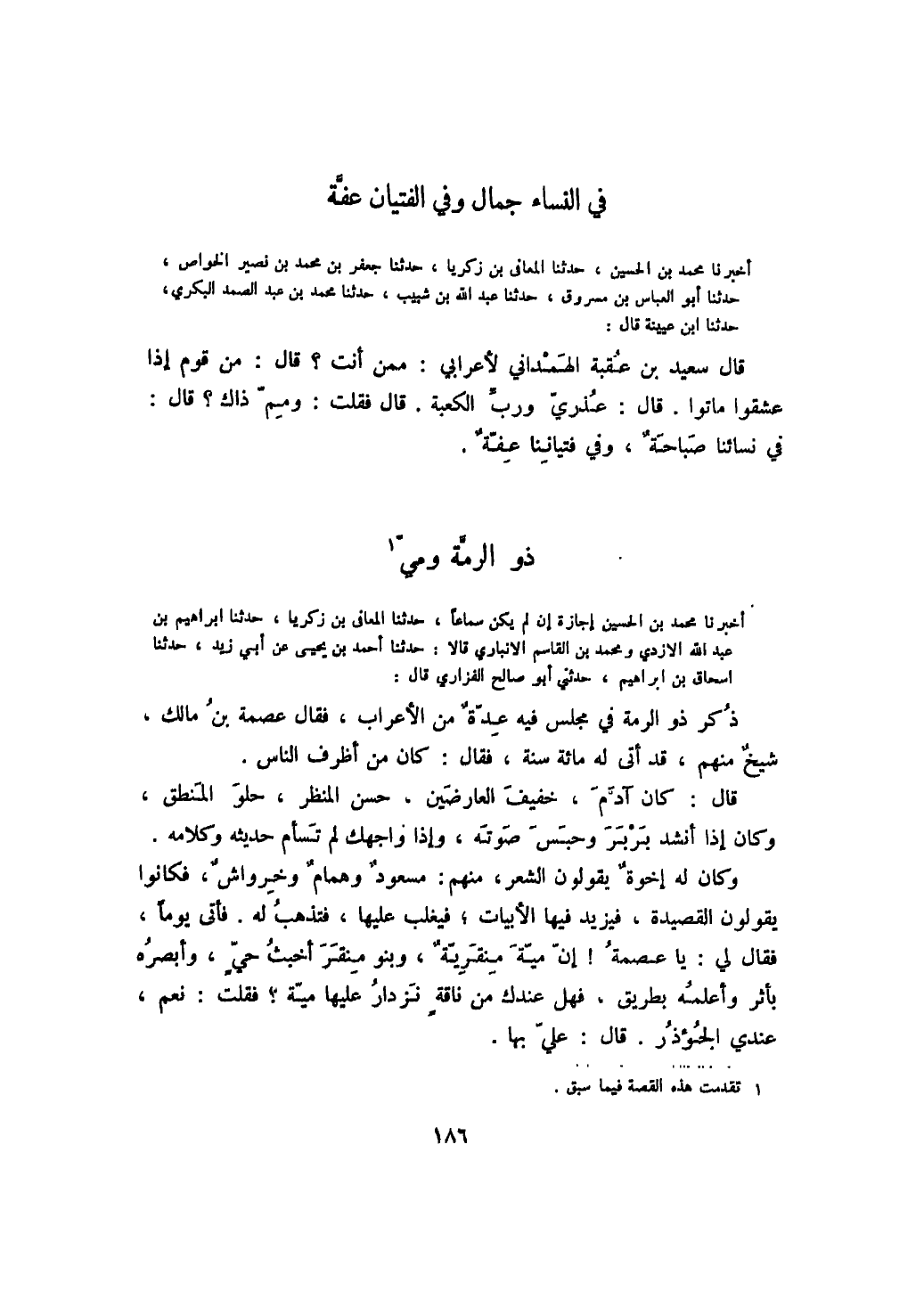 أخبرنا محمد بن الحسين إجازة إن لم يكن سماعاً، حدثنا المعافى بن زكريا، حدثنا إبراهيم بن عبد الله الأزدي ومحمد بن القاسم الأنباري قالا: حدثنا أحمد بن يحيى عن أبي زيد، حدثنا إسحق بن إبراهيم، حدثني أبو صالح الفزاري قال: ذكر ذو الرمة في مجلس فيه عدة من الأعراب، فقال عصمة بن مالك، شيخ منهم، قد أتى له مائة سنة، فقال: كان من أظرف الناس.