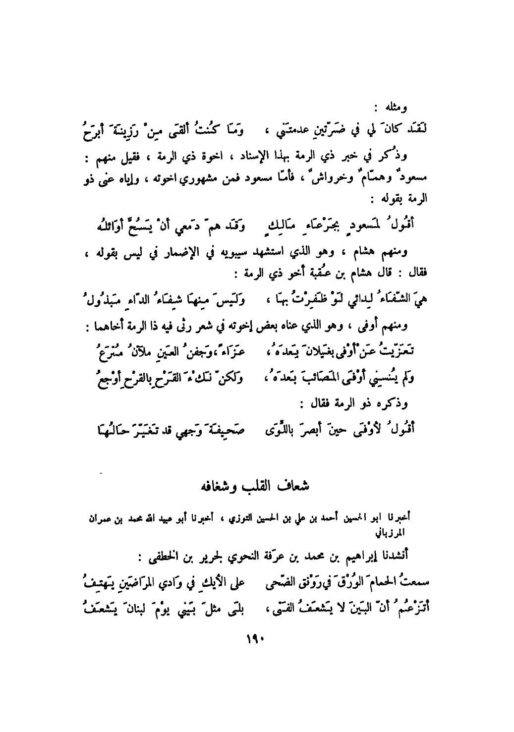 وذكر في خبر ذي الرمة بهذا الإسناد، إخوة ذي الرمة، فقيل منهم: مسعود وهمام وخرواش، فأما مسعود فمن مشهوري إخوته، وإياه عنى ذو الرمة بقوله: