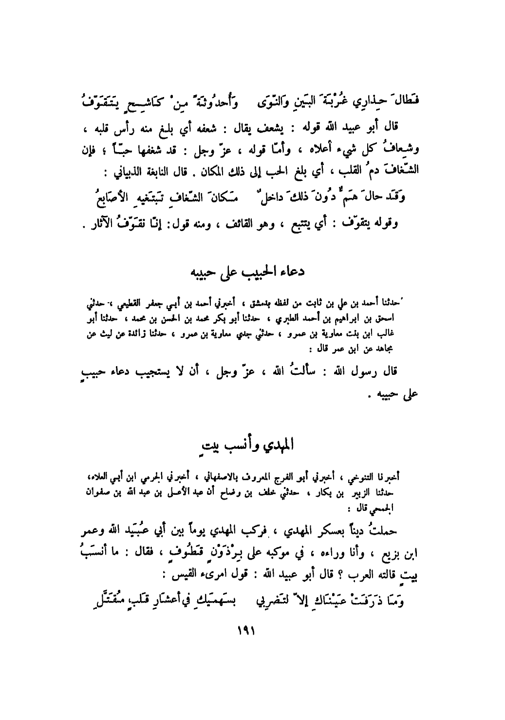 أخبرنا التنوخي، أخبرني أبو الفرج المعروف بالأصفهاني، أخبرني الجرمي ابن أبي العلاء، حدثنا الزبير بن بكار، حدثني خلف بن وضاح أن عبد الأعلى بن عبد الله بن صفوان الجمحي قال: حملت ديناً بعسكر المهدي، فركب المهدي يوماً بين أبي عبيد الله وعمر بن بزيع، وأنا وراءه، في موكبه على برذون قطوف، فقال: ما أنسب بيت قالته العرب؟ قال أبو عبيد الله: قول امرئ القيس: