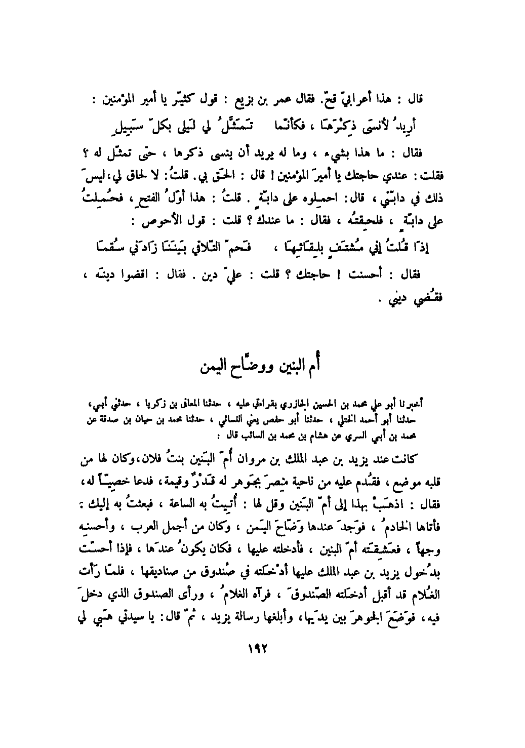 أخبرنا أبو علي محمد بن الحسين الجازري بقراءتي عليه، حدثنا المعافى بن زكريا، حدثني أبي، محمد أبو أحمد الختلي، حدثنا أبو حفص يعني النسائي، حدثنا محمد بن حيان بن صدقة عن محمد بن أبي السري عن هشام بن محمد بن السائب قال: كانت عند يزيد بن عبد الملك بن مروان أم البنين بنت فلان، وكان لها من قلبه موضع، فقدم عليه من ناحية مصر بجوهر له قدر وقيمة، فدعا خصياً له، فقال: اذهب بهذا إلى أم البنين وقل لها: أتيت به الساعة، فلبعثت به إليك. فأتاها الخادم، فوجد عندها وضاح اليمن، وكان من أجمل العرب، وأحسنه وجهاً، فعشقته أم البنين، فأدخلته عليها، فكان يكون عندها، فإذا أحست بدخول يزيد بن عبد الملك عليها أدخلته في صندوق من صناديقها، فلما رأت الغلام قد أقبل أدخلته الصندوق، فرآه الغلام، ورأى الصندوق الذي دخل فيه، فوضع الجوهر بين يديها، وأبلغها رسالة يزيد، ثم قال: يا سيدتي هبي لي