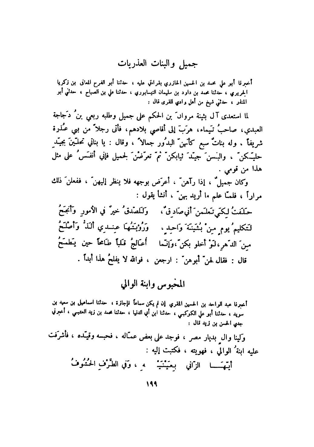 أخبرنا أبو علي بن الحسين الجازري بقراءتي عليه، حدثنا أبو الفرج المعافى بن زكريا الجريري، حدثنا محمد بن داود بن سليمان النيسابوري، حدثنا علي بن الصباح، حدثني أبو المنذر، حدثني شيخ من أهل وادي القرى قال: لما استعدى آل بثينة مروان بن الحكم على جميل وطلبه ربعي بن دجاجة العبدي، صاحب تيماء، هرب إلى أقاصي بلادهم، فأتى رجلاً من بني عذرة شريفاً، وله بنات سبع كأنهن البدور جمالاً، وقال: يا بناتي تحلين بجيد حليكن، والبسن جيد ثيابكن ثم تعرضن لجميل فإني أنفس على مثل هذا من قومي.