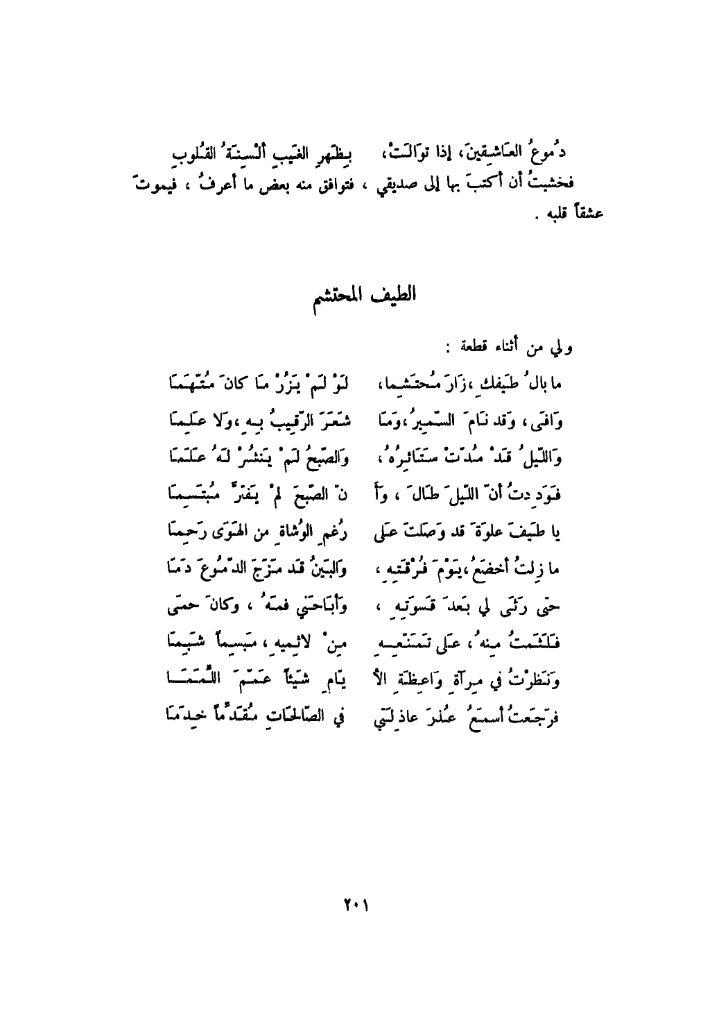 ما بالُ طَيفكِ، زارَ مُحتَشِما، ... لَوْ لَمْ يَزُرْ مَا كَانَ مُتّهَما