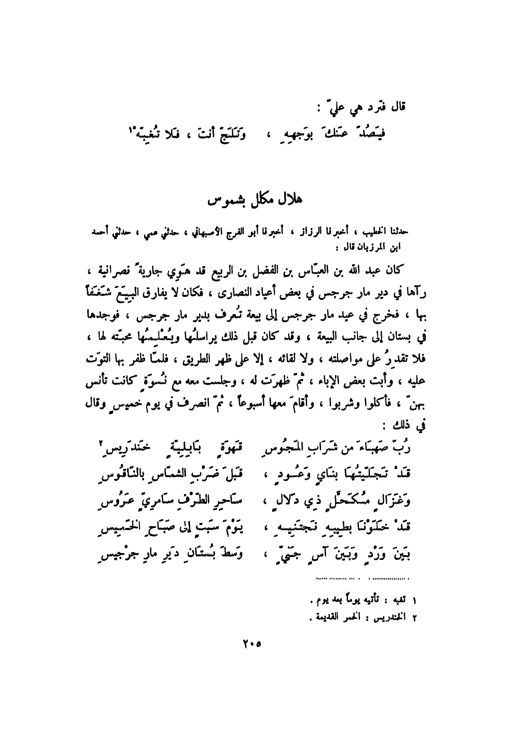 حدثنا الخطيب، أخبرنا الرزاز، أخبرنا أبو الفرج الأصفهاني، حدثني عمي، حدثني أحمد بن المرزبان قال: كان عبد الله بن العباس بن الفضل بن الربيع قد هوي جاريةً نصرانية، رآها في دير مار جرجس في بعض أعياد النصاري، فكان لا يفارق البيع شغفاً بها، فخرج في عيد مار جرجس إلى بيعة تعرف بدير مار جرجس، فوجدها في بستان إلى جانب البيعة، وقد كان قبل ذلك يراسلها ويعلمها محبته لها، فلا تقدر على مواصلته، ولا لقائه، إلا على ظهر الطريق، فلما ظفر بها التوت عليه، وأبت بعض الإباء، ثم ظهرت له، وجلست معه مع نسوة كانت تأنس بهن، فأكلوا وشربوا، وأقام معها أسبوعاً، ثم انصرف في يوم خميس وقال في ذلك: