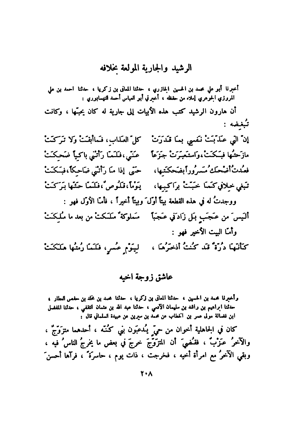 أخبرنا أبو علي محمد بن الحسين الجازري، حدثنا المعافى بن زكريا، حدثنا أحمد بن علي المروزي الجوهري إملاء من حفظه، أخبرني أبو العباس أحمد النيسابوري: أن هارون الرشيد كتب هذه الأبيات إلى جارية له كان يحبها، وكانت تبغضه: