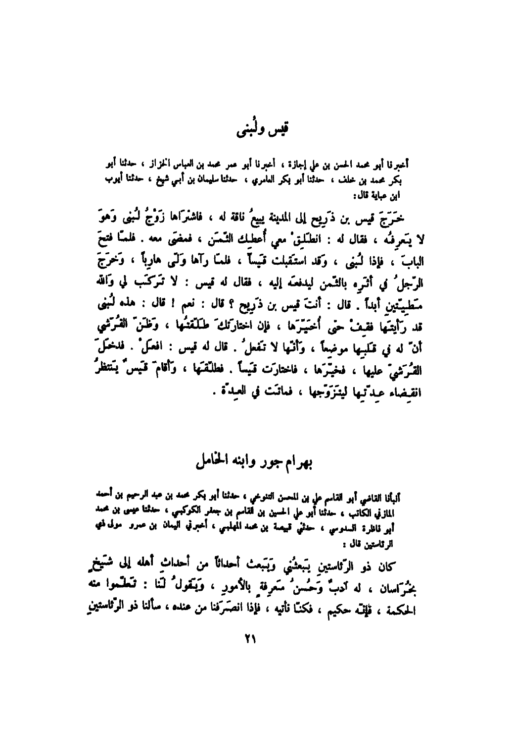 أخبرنا أبو محمد الحسن بن علي إجازة، أخبرنا أبو عمر محمد بن العباس الخزاز، حدثنا أبو بكر محمد بن خلف، حدثنا أبو بكر العامري، حدثنا سليمان بن أبي شيخ، حدثنا أيوب ابن عباية قال: