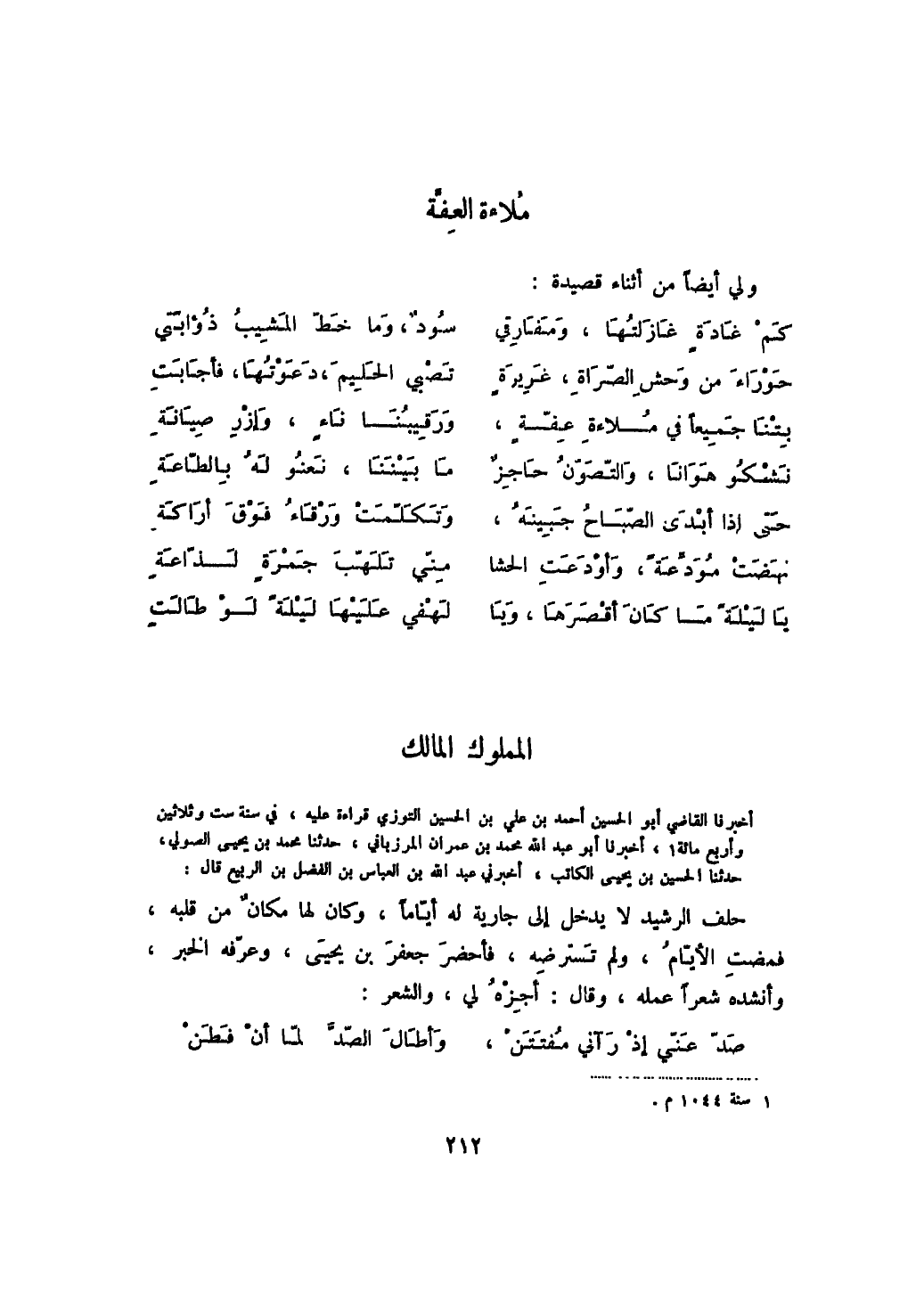 أخبرنا القاضي أبو الحسين أحمد بن علي بن الحسين التوزي قراءة عليه، في سنة ست وثلاثين وأربع مائة، أخبرنا أبو عبد الله محمد بن عمران المرزباني، حدثنا محمد بن يحيى الصولي، حدثنا الحسين بن يحيى الكاتب، أخبرني عبد الله بن العباس بن الفضل بن الربيع قال: حلف الرشيد لا يدخل إلى جارية له أياماً، وكان لها مكان من قلبه، فمضت الأيام، ولم تسترضه، فأحضر جعفر بن يحيى، وعرفه الخبر، وأنشده شعراً عمله، وقال: أجزه لي، والشعر: